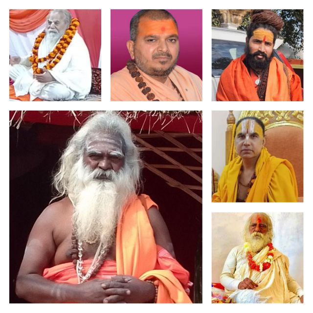 फोटो: क्रमशः अयोध्या मणिराम छावनी के महंत नृत्यगोपाल दास जी महाराज, अयोध्या के महंत कमल नयन दास जी महाराज, जगतगुरु राघवाचार्य जी महाराज अयोध्या, महामंडलेश्वर हरिहरानंद जी महाराज अमरकंटक, महंत बलवीर गिरी जी महाराज प्रयागराज के साथ सोनभद्र के भिखारी बाबा।