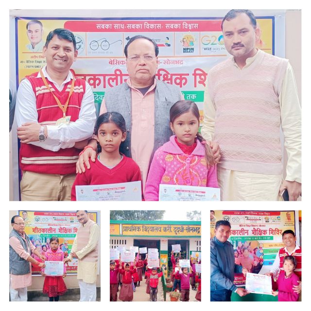 दुद्धी, सोनभद्र। प्राथमिक विद्यालय कर्री दुद्धी सोनभद्र में छः दिवसीय शीतकालीन शिविर का आयोजन किया गया। इस शिविर में विद्यालय के समस्त विद्यर्थियों, शिक्षक गण, अभिभवक एवं ग्रामीणजन सम्मिलित हुए। छः दिवसीय शीतकालीन शिविर में प्राथमिक विद्यालय कर्री एवं अन्य विद्यालय के बच्चों ने भी प्रतिभाग किया। यह शिविर 4 जनवरी से 10 जनवरी 2024 तक प्राथमिक विद्यालय कर्री में आयोजित किया गया। बुधवार को इसके समापन समारोह पर मुख्य अतिथि के रूप में आदरणीय दुद्धी नगर पंचायत चेयरमैन श्री कमलेश मोहन शामिल हुए। नगर पंचायत अध्यक्ष द्वारा माँ सरस्वती की प्रतिमा पर माल्यार्पण किया गया। विद्यालय के छात्र छात्राओं द्वारा प्रभात फेरी निकाल निकाल कर स्वच्छता एवं नशामुक्ति का संदेश दिया। विद्यालय के प्रधानाध्यापक डॉ रमेश कुमार ने अपने उदबोधन में बताया कि आदरणीय खण्ड शिक्षा अधिकारी दुद्धी श्री महेंद्र मौर्या सर के प्रोत्साहन स्वरूप इस छः दिवसीय शिविर में बच्चों को आपदा प्रबंधन, सड़क सुरक्षा, योगाभ्यास, कला एवं शिल्प, संगीत के साथ साथ जीवन कौशल में वृद्धि का प्रशिक्षण दिया गया। आदरणीय दुद्धी नगर पंचायत अध्यक्ष ने इस शीतकालीन शिविर की खुले मन से प्रशंसा की और बताया कि यह मुख्य विकाश अधिकारी की शानदार पहल है। साथ ही प्रधानाध्यापक डॉ रमेश कुमार की प्रशंसा करते हुए सम्मानित किया। ग्राम प्रधान श्री त्रिभुवन यादव ने बताया कि प्राथमिक विद्यालय कर्री एक निपुण विद्यालय है और शीतकालीन शिविर एक सराहनीय प्रयास है। प्रधानाध्यापक ने शिविर के सफल संचालन में स्टॉफ श्री नित्यानंद ,रामकली एवं रसोईयां की प्रशंसा की। प्रधानाध्यापक ने बताया कि ग्राम प्रधान श्री त्रिभुवन यादव एवं SMC अध्यक्ष श्री बेचू सिंह द्वारा शिविर के सफल संचालन में हर संभव सहयोग प्रदान किया गया है। डॉ रमेश कुमार द्वारा उपस्थित दुद्धी नगर पंचायत अध्यक्ष श्री कमलेश मोहन, ग्राम प्रधान श्री त्रिभुवन यादव कर्री, SMC अध्यक्ष श्री बेचू सिंह, छात्र – छात्राओं, अभिभावकों एवं ग्रामीणजनों के प्रति आभार प्रकट किया। इस अवसर पर भारी संख्या में अभिभावकों में श्री रामचन्द्र, रामप्रसाद, राम लखन,सुखलाल, सुकवरिया देवी, हिरमतिया देवी,छठन पाल, नरेंद्र पाल, अक्षय लाल, हीरा सिंह, विकाश दुबे,ज्ञान चंद ,रमेश कुमार,लालमन एवं करताज की उपस्थिति रही।