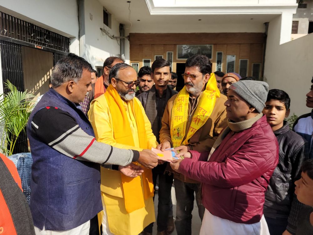 संघ के स्वयंसेवियों ने विधायक के आवास पहुंचकर भेंट किया पूजित अक्षत, प्रभु राम की तस्वीर और निमंत्रण पत्र