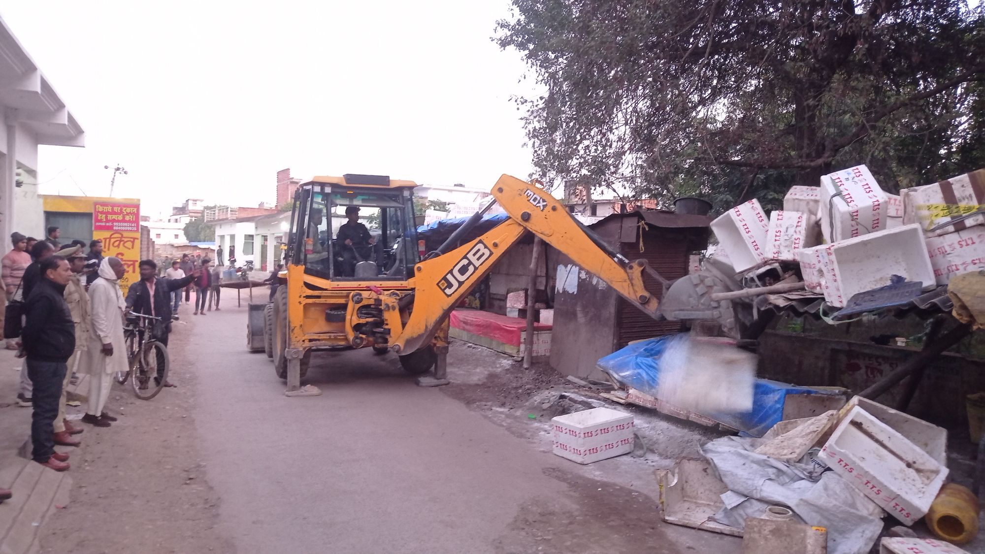 नगर पंचायत प्रशासन बुलडोजर लेकर पुलिस फोर्स के साथ मलदेवा रोड के पटरी पर मिट दुकान के अतिक्रमण हटाने के लिए जेसीबी मशीन (बुलडोजर) पहुंचा तो दुकानदारों में हड़कंप मच गया। प्रशासन ने पटरी पर हुए अतिक्रमण को हटाना शुरू हुआ तो लगातार दर्जनों दुकान धराशायी हो गई। मिट दुकानदार ने सड़क की पटरी किनारे अतिक्रमण कर दुकान बना रखे थे। दुकानों पर बुलडोजर की कार्रवाई चलने लगी तो हड़कंप मच गई। अधिशासी अधिकारी रामसमुख ने बताया कि कार्रवाई से पहले अतिक्रमणकारियों को नगर पंचायत द्वारा हटाने को लेकर नोटिस दिया गया था। लेकिन दुकानदारों की लापरवाही होने पर जेसीबी मशीन से हटाने का निर्देश मिलते ही अतिक्रमण को मुक्त कर दिया गया। इस अवसर पर प्रभारी निरीक्षक नागेश सिंह, कस्बा चौकी इंचार्ज आशीष पटेल, महिला थानाध्यक्ष सहित पीएसी बल मौजूद रही।