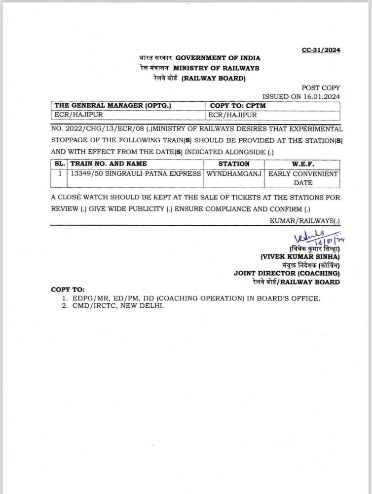 विंढ़मगंज, सोनभद्र (सुमन गुप्ता)। स्थानीय विंढ़मगंज रेलवे स्टेशन पर पटना सिंगरौली एक्सप्रेस ट्रेन नंबर 13349/13350 का विन्ढमगंज मे ठहराव किया जाएगा। ट्रेन के ठहराव विन्ढमगंज क्षेत्र की जनता व रेल रोको संघर्ष समिति के द्वारा लगातार मांग की जा रही थी उक्त ट्रेन कोविड 19 के दौरान से ही बंद की गई थी इस संबंध मे माननीय रेल मंत्री अश्विनी वैष्णव जी से पत्राचार के माध्यम से सोनभद्र सांसद पकौड़ी लाल कोल जी पलामू झारखंड सांसद बीडी राम जी रेलवे बोर्ड के जॉइंट सेक्रेटरी एस के गौतम जी तथा भवनाथपुर विधानसभा क्षेत्र के विधायक और पूर्व मंत्री भानु प्रसाद शाहि जी तथा एसके गौतम जी के द्वारा व्यक्तिगत मुलाकात क्रमांक किया गया था उक्त ट्रेन के ठहराव हेतु रेलवे बोर्ड द्वारा अधिसूचना जारी कर दिया गया है और बहुत जल्द तिथि निर्धारित कर विन्ढमगंज रेलवे स्टेशन पर कार्यक्रम आयोजित कर पटना सिंगरौली एक्सप्रेस का विधिवत ठहराव सोनभद्र सांसद/ पलामू सांसद के द्वारा शुभारंभ किया जाएगा और ट्रेन का विन्ढमगंज रेलवे स्टेशन पर ठहराव होने से यात्री का आवागमन में सहूलियत होगी।
