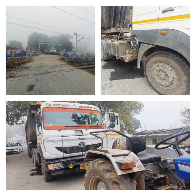 रेलवे क्रॉसिंग के ऊंचे स्पीड ब्रेकर पर लगकर ट्रक का चैंबर फटा कई ट्रेन हुई लेट
