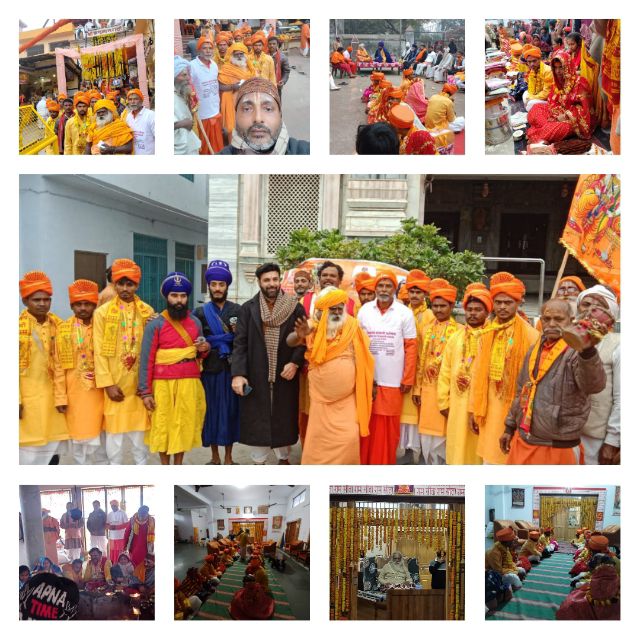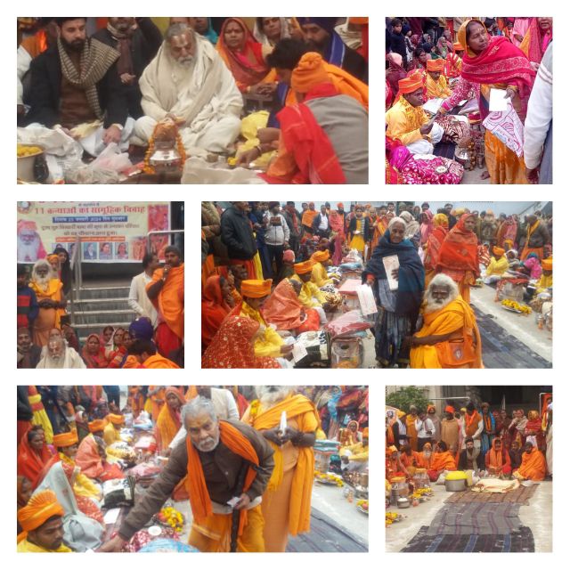फोटो: अयोध्या मणिराम छावनी धर्म मंडप में जड़ी बूटियों से बनी हवन सामग्री से आहुति डालते लोग। 10 आदिवासी कन्याओं की शादी कराते आचार्यगण के साथ मौजूद महंत कमल नयन दास जी महाराज और बाबा हरजीत सिंह। वर वधुओ को आशीर्वाद देते महंत नृत्य गोपाल दास जी महाराज। हनुमान गढ़ी वरों को दर्शन कराने जाते भिखारी बाबा