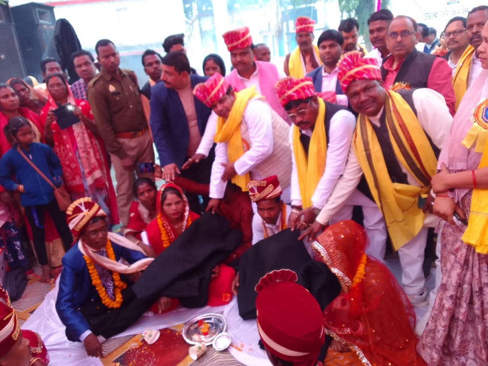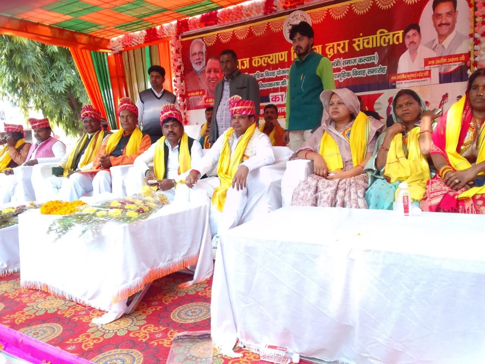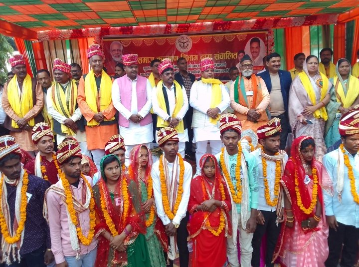 जी व मा.मंत्री जी को बधाई देते है।इस कार्यक्रम में हमारी जिम्मेदारी है कि सभी लकड़ियों को अपनी लकड़ी समझकर विवाह विधिपूर्वक सम्पन्न कराएं।इस वैवाहिक कार्यक्रम से गरीब परिवार का व्यक्ति अपनी बेटी की शादी के लिए कर्ज लेता था परन्तु अब उसे कर्ज से छुटकारा मिल रहा है।नए वर वधुओ को मंत्रीजी व ब्लॉक प्रमुख द्वारा कम्बल भी बांटा गया।इस दौरान जिला समाज कल्याण अधिकारी, एडीओ पंचायत कांशीराम ठाकुर,सुधीर कुमार,ग्राम पंचायत अधिकारी सुरेंद्र कुमार,रामवृक्ष,रामबहादुर सिंह,भाजपा मंडल अध्यक्ष मोहरलाल खरवार,सुजीत सिंह,जिला पंचायत सदस्य किरबिल जनकधारी गोंड़ सहित ग्राम प्रधान गण मौजूद रहे।