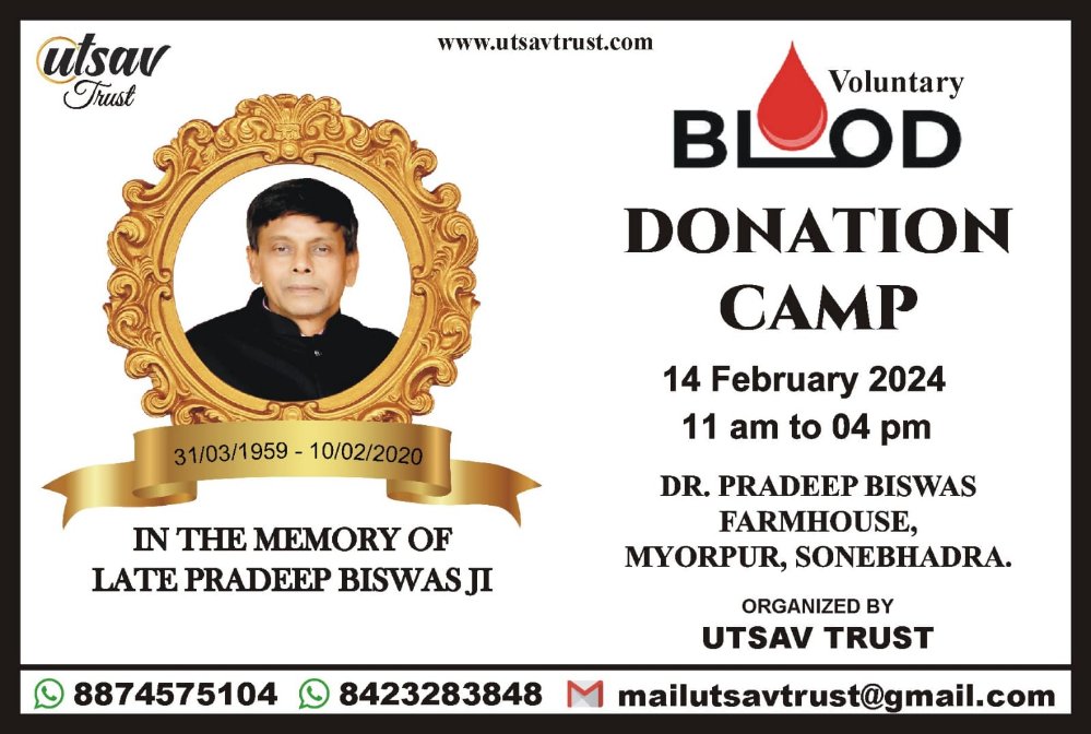 म्योरपुर। स्थानीय कस्बे में उत्सव ट्रस्ट द्वारा 14 फरवरी को रक्तदान शिविर का आयोजन किया गया है।उक्त आशय की जानकारी देते हुए ट्रस्ट के प्रशांत कुमार विश्वास ने कहा कि स्वर्गीय प्रदीप कुमार विश्वास की स्मृति में रक्तदान शिविर का आयोजन किया गया है।