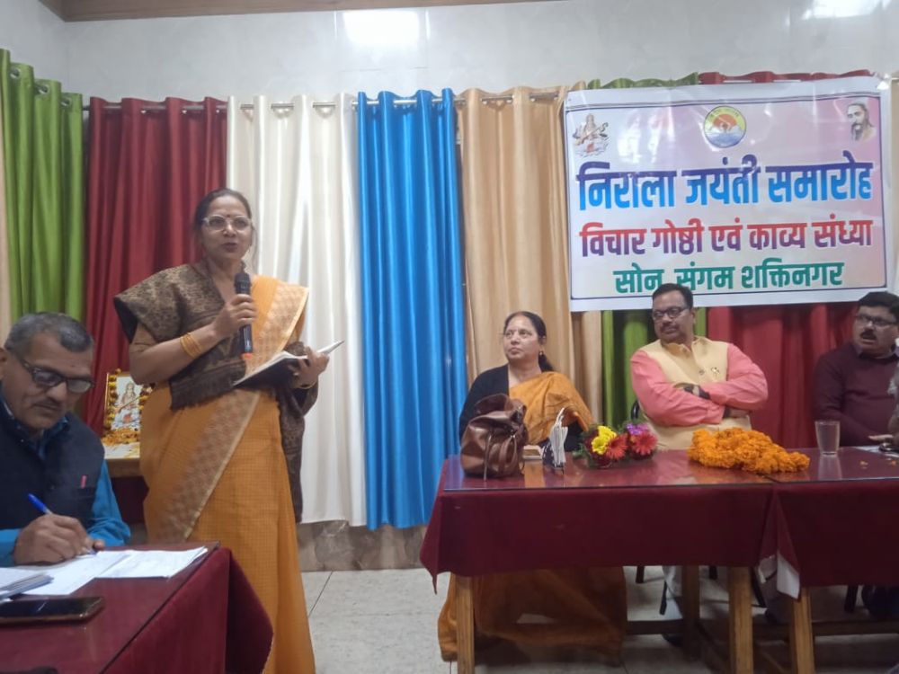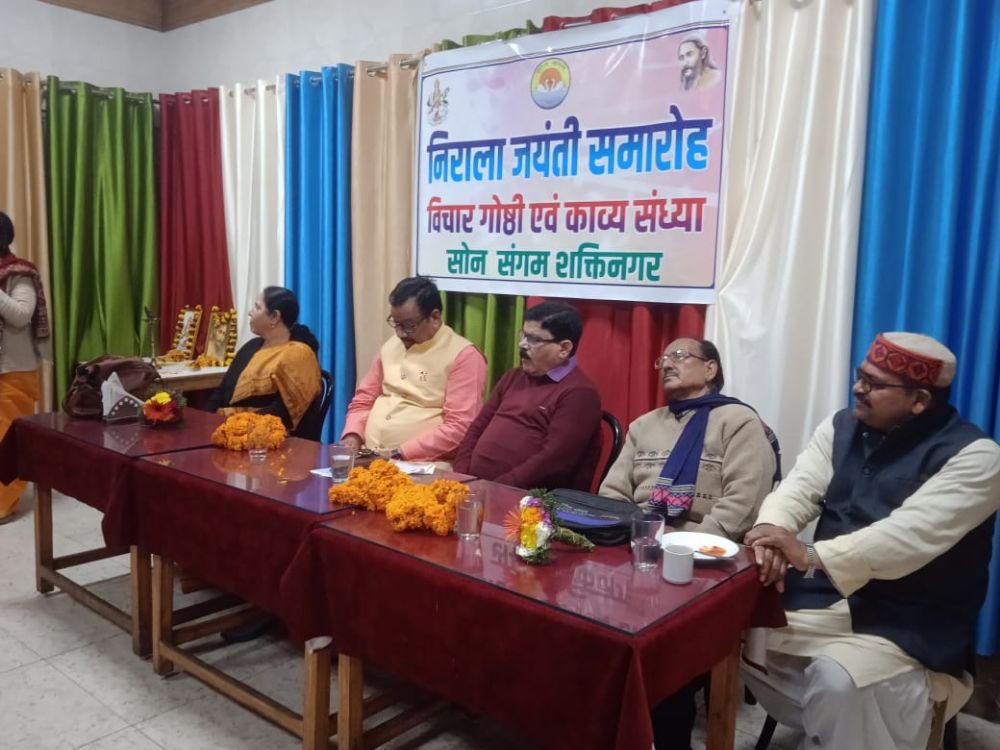 शक्तिनगर/सोनभद्र साहित्यिक सामाजिक संस्था सोन संगम की तरफ से महाप्राण निराला की जयंती के अवसर पर विचार गोष्ठी एवं काव्य संध्या का आयोजन किया गया। इस कार्यक्रम की मुख्य अतिथि केंद्रीय विद्यालय शक्ति नगर की प्रधानाचार्य श्रीमती प्रीति शर्मा रही। विशिष्ट अतिथि के रूप में विवेकानंद शिशु मंदिर शक्तिनगर के प्रधानाचार्य श्री गोपाल तिवारी जी तथा दूसरे विशिष्ट अतिथि के रूप में सरस्वती शिशु मंदिर इंटर कॉलेज खडिया के प्रधानाचार्य श्री राजीव कुमार जी उपस्थित रहे। कार्यक्रम का श्री गणेश मां सरस्वती एवं निराला जी के छायाचित्र पर उपस्थित अतिथियों द्वारा माल्यापर्ण पुष्पांजलि तथा दीप प्रज्वलन से किया गया। केंद्रीय विद्यालय के संगीत शिक्षक श्री बलराम मिश्रा के द्वारा मां सरस्वती की स्तुति प्रस्तुत की गई । अतिथियों का स्वागत श्री विजय कुमार दुबे ने किया ।