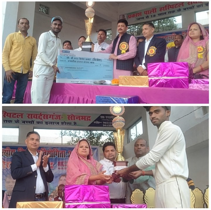 रन, रोहित ने 13 गेंद पर 20 रनों की पारी खेली।गाजीपुर की ओर से आयुष ने तीन विकेट लिया, जबकि अरबाज, अमित व विश्वजीत ने दो-दो विकेट चटकाए।इस तरह गाजीपुर ने 56 रनों से गया को फाइनल में हराकर जीत दर्ज की।अंपायर की भूमिका शमशाद और अजय अग्रहरि ने निभाई फाइनल मुकाबले के बाद विजेता टीम को 31 हजार रुपए की धनराशि व शील्ड दिया गया।इस मौके पर सोनाबच्चा अग्रहरी, लालता प्रसाद जायसवाल, अनिल सिंह, डॉ0 एच0पी0, सिंह,सुषमा सिंह,नंदलाल गोड़, अवनी सिंह, जैफ खान, हरी सिंह,सुजीत अग्रहरि कमेटी के अध्यक्ष रंजीत जायसवाल समेत बड़ी संख्या में लोग मौजूद रहे।