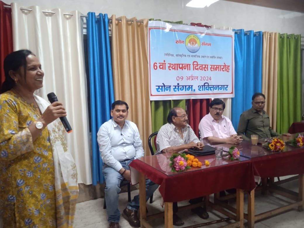 शक्तिनगर/सोनभद्र साहित्यिक सामाजिक संस्था सोन संगम शक्ति नगर की ओर से छठवा स्थापना दिवस का आयोजन किया गया ।इस कार्यक्रम की अध्यक्षता श्री विनय कुमार अवस्थी अपर महाप्रबंधक तकनीकी सेवाएं ,एनटीपीसी शक्तिनगर के द्वारा किया गया । कार्यक्रम का श्री गणेश डॉक्टर बृजेंद्र शुक्ला तथा रविंद्र मिश्रा के द्वारा गणेश वंदना तथा सरस्वती मां की स्तुति से हुआ ।इसके पूर्व उपस्थित अतिथियों द्वारा मां सरस्वती के छायाचित्र पर माल्यार्पण पुष्पांजलि तथा दीप प्रज्जवलन किया गया ।अतिथियों का स्वागत करते हुए श्री विजय कुमार दुबे ने कहा कि आज का दिन कई दृष्टियों से महत्वपूर्ण है। जहां आज पूरा राष्ट्र नव वर्ष मना रहा है वहीं दूसरी हो शक्ति की आराधना भी की जा रही है।सों सोन संगम के सचिव, डा मानिक चंद पांडेय ने सोन संगम की स्थापना की पृष्ठ भूमि की चर्चा करते हुए वर्ष का
