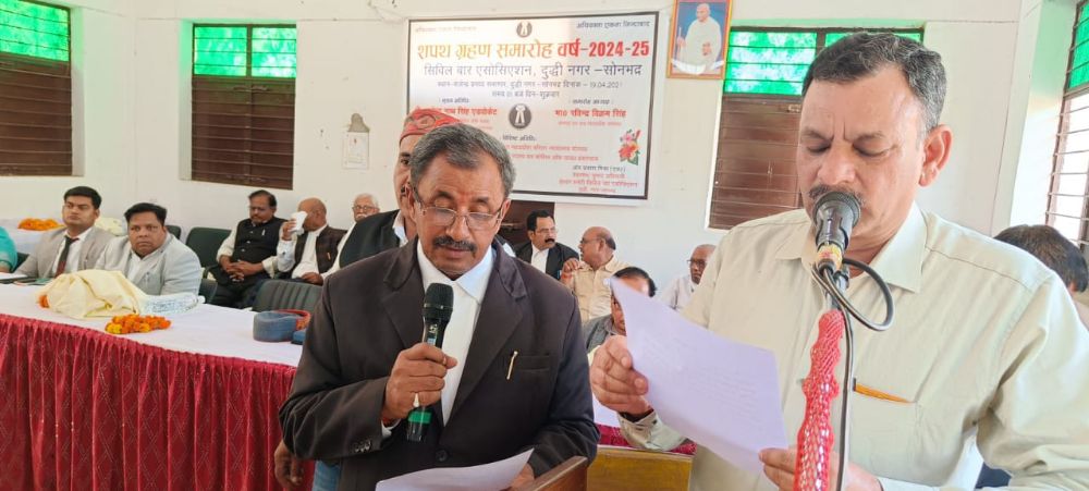 दुद्धी, सोनभद्र। शुक्रवार को सिविल बार एसोसिएशन की नई कार्यकारिणी ने पद एवं गोपनीयता की शपथ ली। समारोह में मुख्य अतिथि के रूप में बार काउंसिल ऑफ यूपी के सदस्य विनोद कुमार पांडेय एवं समारोह अध्यक्ष सिविल जज जूनियर डिवीजन अरुण कुमार एवं विशिष्ट अतिथि अपर सिविल जज जूनियर डिवीजन प्रशांत कुमार व दुद्धी चेयरमैन कमलेश मोहन उपस्थित रहे। नवनिर्वाचित कार्यकारिणी के अध्यक्ष विष्णुकांत तिवारी को मुख्य अतिथि श्री पांडेय ने पद एवं गोपनीयता की शपथ दिलाई। वहीं वरिष्ठ उपाध्यक्ष महेंद्र जायसवाल को सिविल जज जूनियर डिवीजन अरुण कुमार एवं सचिव राजेन्द्र प्रसाद को अपर सिविल जज जूनियर डिवीजन प्रशांत कुमार ने शपथ दिलाई।
