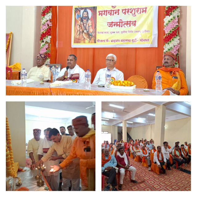 परशुराम जयंती समारोह को सम्बोधित करते हुए मुख्य अतिथि आनंद जी एवं मुनीश जी ने कहा कि हमारी संस्कृति एवं सभ्यता सबसे प्राचीन सभ्यता हैं। ब्राह्मण समाज को एक जुट होकर अपनी सभ्यता और संस्कृति को बचाना है। राम से परसुराम तक कि कहानी आज भी प्रासंगिक है। ब्राह्मण समाज को भगवान परशुराम के सिद्धांतों एवं आदर्शों पर चलने के लिए प्रेरित करता है आज हम सभी को हम सबके आराध्य देव भगवान परशुराम जी के प्रतीक चिन्ह पर चलकर एक सशक्त एवं भयमुक्त भारत बनाने के लिए एकजुट होना होगा। वरिष्ठ अधिवक्ता पंडित रामलोचन तिवारी एवं कार्यक्रम की अध्यक्षता कर रहे सेवानिवृत्ति व्यापार कर कमिश्नर अशोक चौबे ने कहा कि ब्राह्मण समाज के अंदर जो कुरीतियां व्याप्त हो रही है। ब्राह्मण समाज उन कृतियों को दूर करने के लिए जागरूकता अभियान चलाने का कार्य करेगी क्योंकि ब्राह्मण समाज ही समाज को दिशा देता है। ब्राह्मण समाज के ऊपर समाज को सही दिशा में ले जाने की जिम्मेदारी है इसलिए आज भगवान परशुराम के जयंती के दिन हम सारे ब्राह्मण बंधु अपने अंदर और अपने समाज के अंदर व्याप्त कुर्तियां को समाप्त करने का संकल्प लेते हैं। कार्यक्रम का संचालन मनोज मिश्रा एडवोकेट व जितेंद्र चौबे ने किया। इस मौके पर इंद्रभूषण महाराज जी, नंदकिशोर तिवारी, सिविल बार अध्यक्ष विष्णुकांत तिवारी, रामजी पांडेय, सदानंद मिश्रा, मदन मोहन तिवारी, राकेश तिवारी, कुलभूषण पांडेय, मनोज तिवारी, विवेक शांडिल, विवेक पांडेय, मनीष तिवारी, बुन्देल चौबे, रामानुज दुबे, अरुण पाण्डेय, शशिकांत तिवारी सहित अन्य उपस्थित रहे।