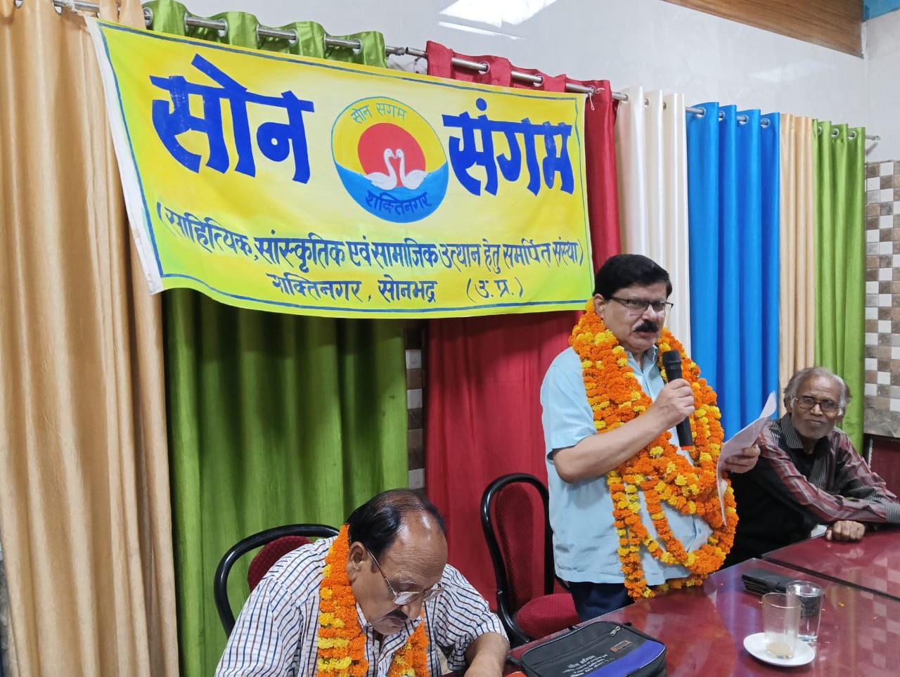 शक्तिनगर/सोनभद्र साहित्यिक सामाजिक संस्था सोन संगम शक्तिनगर के तरफ से कबीर दास की जयंती के अवसर पर विचार गोष्ठी एवं काव्य संध्या का आयोजन किया गया। कार्यक्रम का श्री गणेश डा बृजेंद्र शुक्ला एवं प्रज्ञा चक्षु रविंद्र मिश्रा के द्वारा सरस्वती वंदना से हुआ। इसके उपरांत रविंद्र मिश्रा जी द्वारा कबीर का चर्चित भजन ,बीत गए दिन भजन बिना रे,, तथा,,कुछ लेना न देना मगन रहना,, की प्रभावशाली प्रस्तुति से कार्यक्रम को एक नई ऊंचाई तथा माहौल को सकारात्मक स्वरूप प्रदान किया।