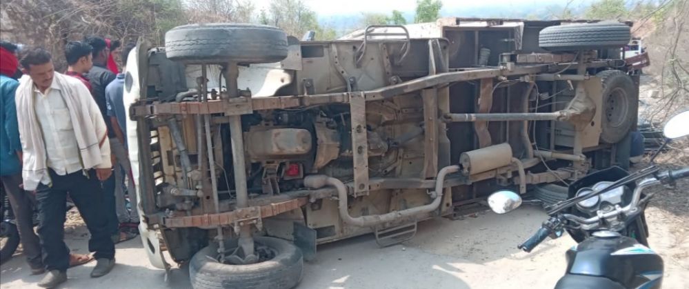 क्षतिग्रस्त सड़क-सरिया लदी पिकअप पलटी