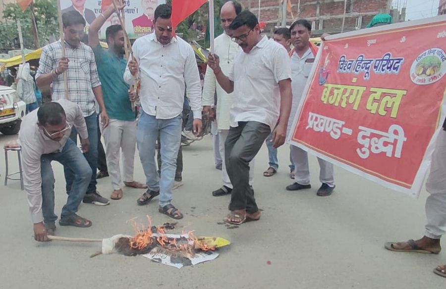 दुद्धी, सोनभद्र। विहिप एवं भाजपा के कार्यकर्ताओं ने रविवार को कस्बे के तहसील तिराहे पर राहुल गांधी का पुतला फूंका। कांग्रेस सांसद और लोकसभा में विपक्ष के नेता राहुल गांधी द्वारा संसद में हिंदुओं को हिंसक बताए जाने वाले बयान को लेकर विश्वहिंदू परिषद व बीजेपी कार्यकर्ताओं में आक्रोश देखने को मिला।कार्यकर्ताओं ने दुद्धी नगर में प्रदर्शन कर राहुल गांधी के खिलाफ जमकर नारेबाजी की और उनके पुतला जलाकर अपना विरोध जताया। इस अवसर पर भाजपा जिला मंत्री दिलीप पांडेय, कन्हैया लाल अग्रहरी, संदीप गुप्ता, संजू तिवारी राकेश श्रीवास्तव, सुमित सोनी, मनीष, पीयूष अग्रहरी, आलोक जायसवाल, धीरज जायसवाल, सोनू जायसवाल, अजय चन्द्रवंशी, विकास मद्देशिया, पीयूष कसेरा, राहुल अग्रहरी, प्रियांशु अग्रहरी, शनि कश्यप, अभिषेक कुमार सहित विहिप और भाजपा कार्यकर्ता उपस्थित रहे।