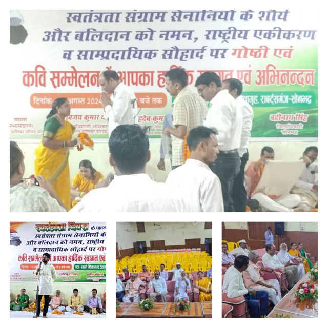 सोनभद्र (राजेश पाठक एड)। जिला प्रशासन द्वारा विवेकानंद प्रेक्षागृह में कवि सम्मेलन का आयोजन स्वतंत्रता दिवस समारोह के उपलक्ष्य में शाम को आयोजित किया गया जिसमें अध्यक्षता कर रहे वरिष्ठ साहित्यकार अजयशेखर जिला सूचना अधिकारी तथा नगरपालिका सोनभद्र नगर अधिशासी अधिकारी के द्वारा दीपदान कर विधिवत शुभारंभ वाणी वंदना ईश्वर विरागी,,,मन पावन मां निर्मल कर दे से आगाज हुआ।सभीं कवियों को अंगवस्त्र लेखनी पुस्तिका देकर सम्मानित किया गया।ओज की कवयित्री कौशल्या कुमारी चौहान ने दिल में हिंदोस्तान रखती हूं गीता बाइबिल कुरान रखती हूं सुनाकर देशभक्ति का जज्बा जगाया। प्रथम सत्र का संचालन कर रहे वरिष्ठ पत्रकार भोला नाथ मिश्र द्वारा जनपद सोनभद्र का स्वतंत्रता संग्राम के योगदान व कौमी एकता के संदर्भ में वृहद वक्तव्य देकर समूचे परिदृश्य को रेखांकित किया गया। संयोजक जगदीश पंथी ने दूसरे सत्र का संचालन करते हुए,,,शहीद के अर्थ बतावै के दिन हौ पन्द्रह अगस्त सुनाया। शहीद स्थल प्रवंधन ट्रस्ट करारी सोनभद्र के निदेशक प्रदुम्न त्रिपाठीएड ने ,, तिरंगा तुझे हम कभीं झुकने नहीं देंगे,,मिट जायेंगे खुद तुझे मिटने नहीं देंगे सुनाया वाहवाही बटोरी। प्रभात सिंह चंदेल ने जिगर में हिंद हांथ में तिरंगा है तो वहीं दिलीप सिंह दीपक ने तुम सब कुछ बेच दो लेकिन हिंदुस्तान मत बेचो सुनाकर सत्ता को नसीहत दी।शायर अब्दुल हई ने,रो के बुलबुल ने कहा कैद से रिहा न करो गुलसितां पर अभी सैयाद के पहरे होंगे गंभीर रचना देकर गतिज ऊर्जा प्रदान किया। धर्मेश चौहान एड ने देश पे मेरा सबकुछ तन मन धन समर्पित है सुनाकर राष्ट्र अनुराग जगाया तो वहीं जयराम सोनी सुधाकर स्वदेशप्रेम दयानंद दयालू दिवाकर द्विवेदी मेघ अंतरराष्ट्रीय कवयित्री डा, रचना तिवारी राकेश शरण मिस्र एडवोकेट पारसनाथ मिश्र प्रेमी बौद्ध अनुपमा वाणी कवयित्री अमरनाथ अजेय दीपक केसरवानी सुधाकर स्वदेशप्रेम ने विविधता युक्त गीत गजल मुक्तक छंद सवैया श्रृंगार नवगीत लोकभाषा ओज वीर रस की कविताएं सुनाकर श्रोताओं को मंत्रमुग्ध कर दिया। अध्यक्षता कर रहे वरिष्ठ साहित्यकार अजयशेखर ने गरीबी भुखमरी अब न रहने पायेंगी यहां,, भाषणों का दाना रोज बांटा जा रहा,, सुनाकर तथा देश की दशा दिशा को रेखांकित करते हुए देश को सत्ता के केन्द्र में रखकर काम करने की नसीहत दी और आयोजन को विराम दिया। आभार जिला सूचना अधिकारी धन्यवाद ज्ञापित नगरपालिका अधिशासी अधिकारी ने व्यक्त किया।इस अवसर पर सैकड़ों श्रोतागण देर शाम तक जमे रहे।