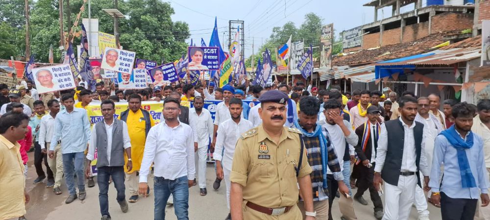 राम विचार गौतम, राजेश धुसिया, रमेश सिंह कुशवाहा, राजु कुमार ने पार्टी के निर्देश पर नगर में टीसीडी ग्राउंड से भव्य जुलूस निकाल कर नगर भ्रमण किया। नगर भ्रमण के बाद तहसील गेट के मुख्य द्वार पर तहसीलदार ज्ञानेंद्र यादव को राष्ट्रपति नामित ज्ञापन सौंपा। इस दौरान आजाद समाज पार्टी भीम आर्मी के कार्यकर्ताओं ने भी तहसीलदार को ज्ञापन सौपा। ज्ञापन देते हुए उन्होंने कहा कि आरक्षण के अनुसूचित जाति व जनजाति से संबंधित संगठनों में भारी आक्रोश व्याप्त है। सैकड़ों की संख्या में विंढमगंज से कार्यकर्ता बाइक से आकर जुलूस में शामिल हुए। इस अवसर पर फौजदार परस्ते, सुरेंद्र पोया सहित अन्य लोग उपस्थित रहे। ज्ञापन देने के बाद बसपा कार्यकर्ताओं ने टीसीडी ग्राउंड पहुँच कर कार्यक्रम का समापन किया। सीओ प्रदीप सिंह चन्देल, प्रभारी निरीक्षक मनोज कुमार सिंह, कस्बा चौकी इंचार्ज महेंद्र प्रताप सिंह, विंढमगंज, म्योरपुर, हाथीनाला थानाध्यक्ष सहित पीएसी के जवान मौजूद रहे।