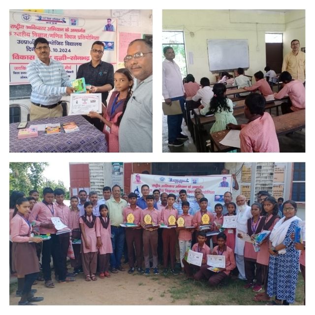 दुद्धी, सोनभद्र। राजकीय इंटर कालेज, दुद्धी में शुक्रवार को ब्लॉक दुद्धी के समस्त उच्च प्राथमिक एवं कंपोजिट विद्यालयों के बच्चों की राष्ट्रीय आविष्कार अभियान परीक्षा सकुशल शुचितापूर्ण ढंग से संपन्न हुई। कुल 204 परीक्षार्थियों में से 184 ने परीक्षा दी। पाली का रिजल्ट घोषित होने के पश्चात शीर्ष 25 बच्चों का साक्षात्कार हुआ।इसके बाद शीर्ष 5 बच्चों का चयन जिले स्तर पर किया गया। शीर्ष 5 बच्चे क्रमशः 1.देवांश (कंपोजिट विद्यालय दुद्धी), 2.अजीत (उ प्रा वि दुद्धी),3.हर्ष उ प्रा वि दुद्धी),4.अंश (उ प्रा वि कन्या विद्यालय दुद्धी),5. अजमेर अंसारी (उ प्रा वि बघाडू) को खण्ड शिक्षा अधिकारी व प्रधानाचार्य श्री अजय कुमार सिंह द्वारा संयुक्त रूप से पुरस्कृत कर मोमेंटो व प्रमाणपत्र दिया गया।शेष अन्य बच्चों को भी प्रमाणपत्र वितरित किया गया।परीक्षा में सम्मिलित बच्चों में उत्साह दिख रहा था।इस अवसर पर परीक्षा केंद्र में उपस्थित खण्ड शिक्षा अधिकारी श्री महेंद्र मौर्या ने कहा कि इस प्रकार की परीक्षाएं देने से विद्यार्थियों में स्वस्थ प्रतियोगिता की भावना का विकास होता है।ब्लॉक दुद्धी के सभी उच्च प्राथमिक व कंपोजिट विद्यालयों से तीन तीन बच्चे उक्त परीक्षा के लिए चयनित किए गए थे।सभी होनहार विद्यार्थियों और शिक्षकों को शुचितापूर्वक परीक्षा संपन्न कराने हेतु शुभकामनाएं प्रेषित करता हूं।इस अवसर पर प्रधानाचार्य श्री अजय कुमार सिंह व अन्य शिक्षक एवं स्टाफ,एआरपी संतोष सिंह,अखिलेश कुमार,शिक्षक राजेश झा, लल्लूराम, मुसईराम,राजकमल,रामरक्षा,सलीमुल्लाह, नीरज कुमार,रेनू कन्नौजिया,प्रवीण द्विवेदी,मनोज पाण्डेय,कमल नारायण सिंह,बिहारी लाल,विजय गुप्ता,रामरहीस,पीयूष आदि उपस्थित थे।