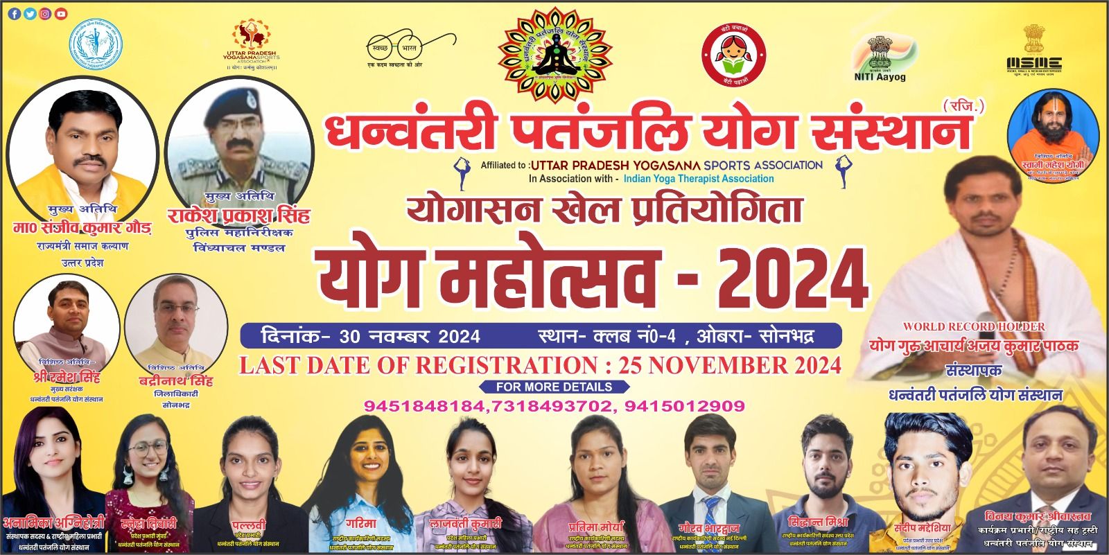 चोपन/सोनभद्र (गुड्डू मिश्रा) भारत सरकार की फिट इंडिया उद्देश्य के तहत उत्तर प्रदेश योगसना स्पोर्ट्स एसोसिएशन और धनवंतरी पतंजलि योग संस्थान के तत्वावधान में 30 नवंबर 2024 को योगासन प्रतियोगिता योग महोत्सव का आयोजन क्लब नम्बर 4 ओबरा सोनभद्र में किया जायेगा कार्यक्रम में मुख्य में मुख्य रूप से समाज कल्याण राज्य मंत्री संजीव गोंड, पुलिस महानिरीक्षक आर.पी.सिंह विंध्याचल ,जिलाधिकारी सोनभद्र ,संस्थान के संरक्षक रमेश सिंह, दिव्य भारत निर्माण ट्रस्ट के संस्थापक पूज्य स्वामी महेश योगी कार्यक्रम में मौजूद रहेंगे । कार्यक्रम में विभिन्न प्रान्तों के योगा प्रतियोगिता में हजारों की संख्या में सम्मिलित होंगे योग प्रतिभागी । उत्तर प्रदेश योगासन स्पोर्ट्स एसोसिएशन एवं धनवंतरी पतंजलि योग संस्थान द्वारा फिट इंडिया योजना के तहत योग प्रतियोगिता योग महोत्सव का भव्य आयोजन दिनांक 30 नवंबर 2024 को प्रात: 7:00 से क्लब नंबर चार ओबरा सोनभद्र में किया जाना सुनिश्चित हुआ है। जिसके क्रम में जिला विद्यालय निरीक्षक सोनभद्र जयराम सिंह ने जिलाधिकारी, उप जिलाधिकारी ओबरा संस्थान के संरक्षक रमेश सिंह, योग गुरु आचार्य संस्थापक धनवंतरी पतंजलि ओबरा को अवगत कराते हुए बताया कि जनपद के समस्त माध्यमिक विद्यालयों /महाविद्यालय के पांच-पांच छात्र – छात्राओं उक्त योगसना योग प्रतियोगिता में प्रतिभाग करना आवश्यक है । प्रतियोगिता में प्रतिभाग किये जाने हेतु पंजीकरण का समय 7:00 बजे से 8:00 तक निर्धारित किया गया है। जिसमें सभी प्रतिभागियों को अपने – अपने साथ आधार कार्ड एवं विद्यालय से निर्गत आईडी कार्ड की छाया प्रति साथ ले आना अनिवार्य है। साथ ही उन्होंने ने बताया कि प्रतियोगिता में विजेता टीम को पुरस्कृत भी किया जाएगा। कार्यक्रम की विस्तृत जानकारी एवं ऑनलाइन पंजीकरण हेतु मोबाइल नंबर 7318493702 9451848184 ,94150 12909 पर संपर्क करने व सभी शिक्षण संस्थानो को कार्यक्रम में अपने विद्यालय में अध्यनरत पांच-पांच मतलब कुल मिलाकर 10 विद्यार्थियों को योगासन प्रतियोगिता कार्यक्रम में प्रतिभा का नेतृत्व विद्यालय के शिक्षक के साथ निर्धारित कार्यक्रम स्थल पर उपस्थित होने का अनुरोध किया है।