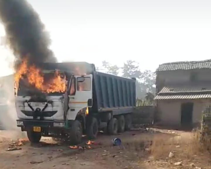अबूझ हालत में खड़ी हाइवा की केबिन में लगी आग मची अफरा तफरी