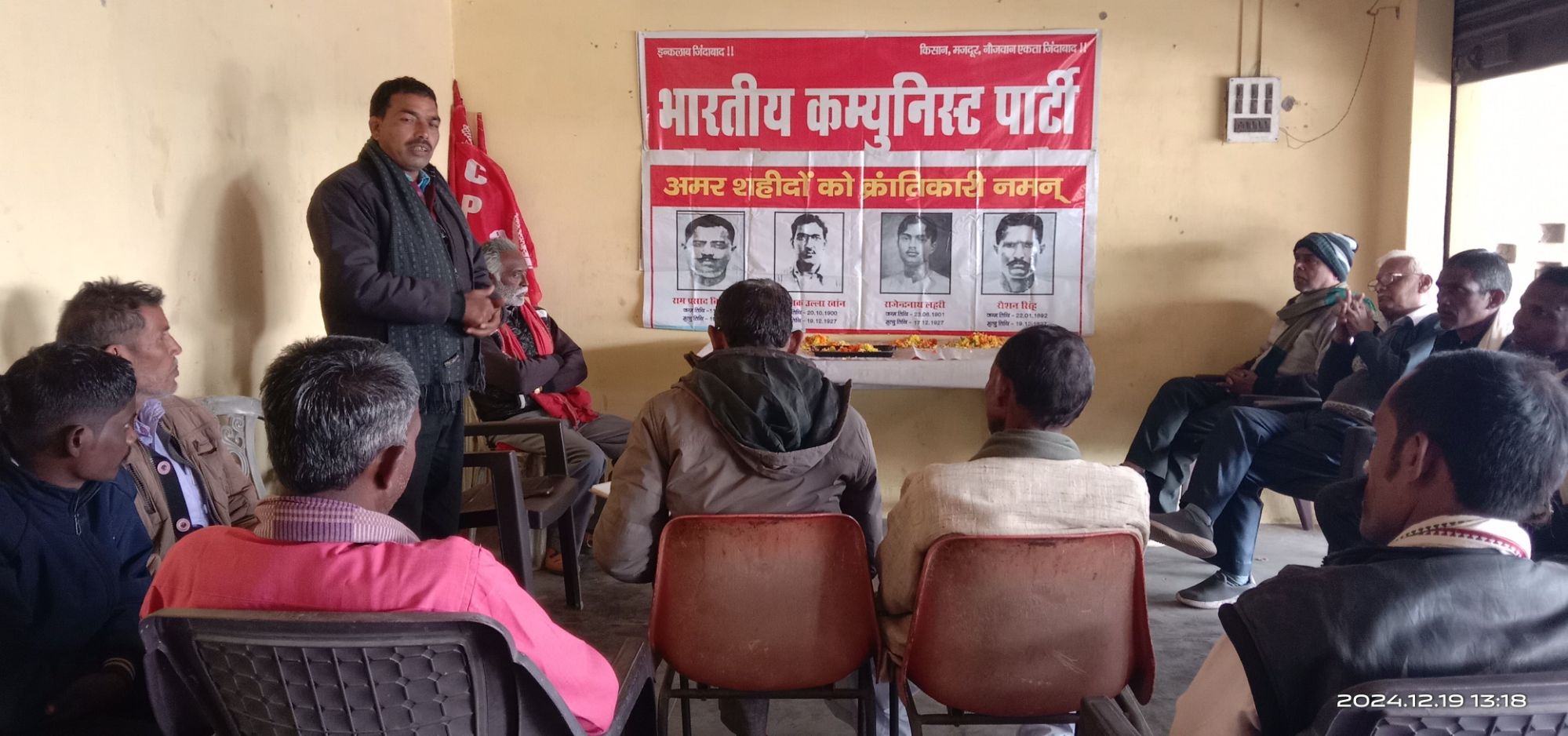 जहां उपस्थिति लोगों ने अमर शहीदों को नमन और श्रद्धा सुमन अर्पित किया। संगोष्ठी को संबोधित करते हुए पार्टी के जिला सचिव आर के शर्मा ने कहा कि आज से 97 वर्ष पहले अंग्रेजी हुकूमत ने हमारे देश के इन चार बीरों रामप्रसाद बिस्मिल, अशफ़ाक उल्ला खां,ठाकुर रोशन सिंह और राजेन्द्र नाथ लाहिड़ी को सन् 1927 में 17 से 19 दिसम्बर के बीच काकोरी केस में फांसी के तख्ते पर चढ़ा दिया था और इन वीरो ने हंसते हसंते फांसी के फंदे को चूम कर अपनी शहादत दे दी। उस दौर में इन क्रांतिकारियों ने धर्म और सम्प्रदाय को ताक पर रखकर जिस देश की आजादी में अपना बलिदान दिया। आज़ उसी देश में धर्म और सम्प्रदाय की राजनीति चल रही है जो दूर्भाग्यपूर्ण है। वर्तमान सत्ता पर काबिज लोग इन क्रांतिकारियों की उस सोच उस विचारधारा सांझी शहादत सांझी विरासत को भूलकर देश में धर्म और उन्माद की राजनीति करते हुए इस देश की विरासत को बेचने पर भी अमादा है और सार्वजनिक क्षेत्रों को कार्पोरेट घरानों को सौंपतीं जा रही है। जिसको रोकने के लिए देश के युवाओं को आगे आना होगा और क्रांतिकारियों के विरासत को आगे बढ़ाते हुए देश की विरासत को भी बचाने में काम करना होगा।