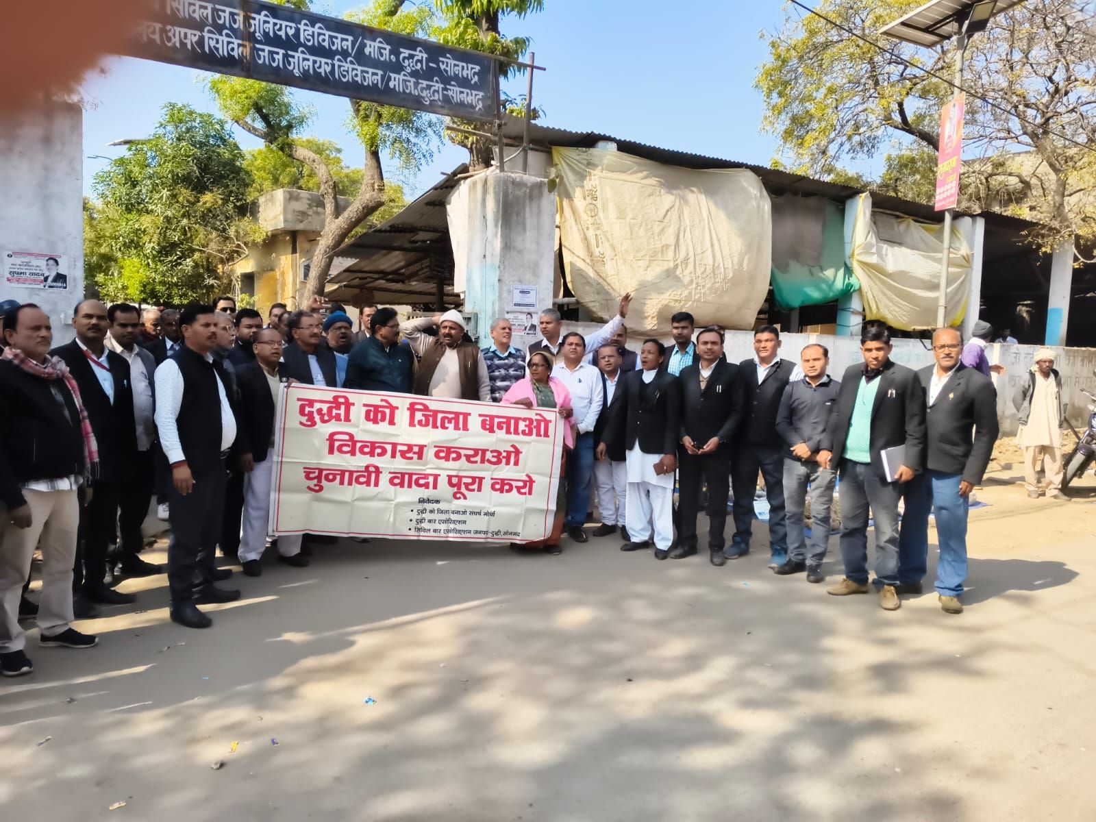 कैप्सन- दुद्धी को जिला बनाओ को लेकर मुंसिफ कोर्ट गेट पर प्रदर्शन करते हुए संघर्ष समिति के लोग।
