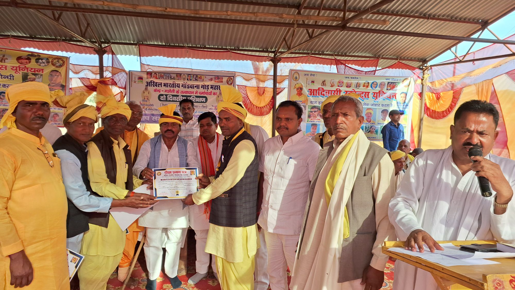 समापन कार्यक्रम के पूर्व दो दिवसीय प्रशिक्षण में प्रमुख धर्माचार्य द्वारा बड़ादेव ठाना पर गोंडी रीति रिवाज के साथ पूजा पाठ किया गया। प्रमुख प्रशिक्षक फतेह बहादुर सिंह मरकाम व सहायक प्रशिक्षक सुखई सिंह पोया ने सोनभद्र चंदौली सहित अन्य जिलों से आये प्रशिक्षणार्थियों को प्रशिक्षित किया। धर्माचार्यों ने कहा कि एक झूठ होकर समाज कुरीतियों को दूर कर संगठन को मजबूत बनाएं और अपनी गोंडी संस्कृति को बचाए रखना। धर्माचार्य का कर्तव्य समाज में आदिवासियों का जो संविधान द्वारा मौलिक अधिकार है। हमें मिल नही पा रहा। विशेष रूप से संविधान की पांचवी अनुसूची को लागू कर विशेष अधिकार दिलाए जाने का अनुरोध किया है। उन्होंने कहा कि गोंडी विवाह, गोंडी प्रथा एवं मृतक संस्कार विवाह संस्कार एवं गृह प्रवेश अनप्राशन संस्कार एवं तमाम आदिवासी समाज के रीति रिवाज से संबंधित समाज को एक सूत्र में बांधकर चलने की नसीहत दी। विशिष्ट प्रशिक्षक रामसूरत नेटी ने गोंडी धर्म को बचाये रखने के लिए आदिवासी स्टूडेंट यूनियन का गठन कर शैला, कर्मा, डोमकच नृत्य के माध्यम से आदिवासी संस्कृति को बचाये रखने का प्रयत्नशील रहा। कार्यक्रम का संचालन फौजदार सिंह परस्ते ने किया। कार्यक्रम की शुरुआत प्रथम दिवस का उद्घाटन विधायक विजय सिंह गोंड ने किया। इस अवसर पर मोहन कुशवाहा, हृदय नारायण सिंह गोंड, रवि गोंड, बबई सिंह गोंड, रामु गोंड पोया, सुरेंद्र पोया, मानरूप, रामकेश, राजेन्द्र ओईका, अशोक मरकाम, ओमप्रकाश शर्मा, रामविचार, रामबृक्ष सहित अन्य लोग उपस्थित रहे।