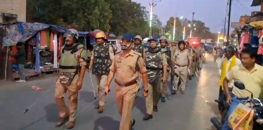 दुद्धी/सोनभद्र दुद्धी संवेदनशील स्थानो पर फ्लैग मार्च का प्रदीप सिंह चंदेल ने कहा कानून से खिलवाड़ करने वाले बख्शे नहीं जायेंगे।