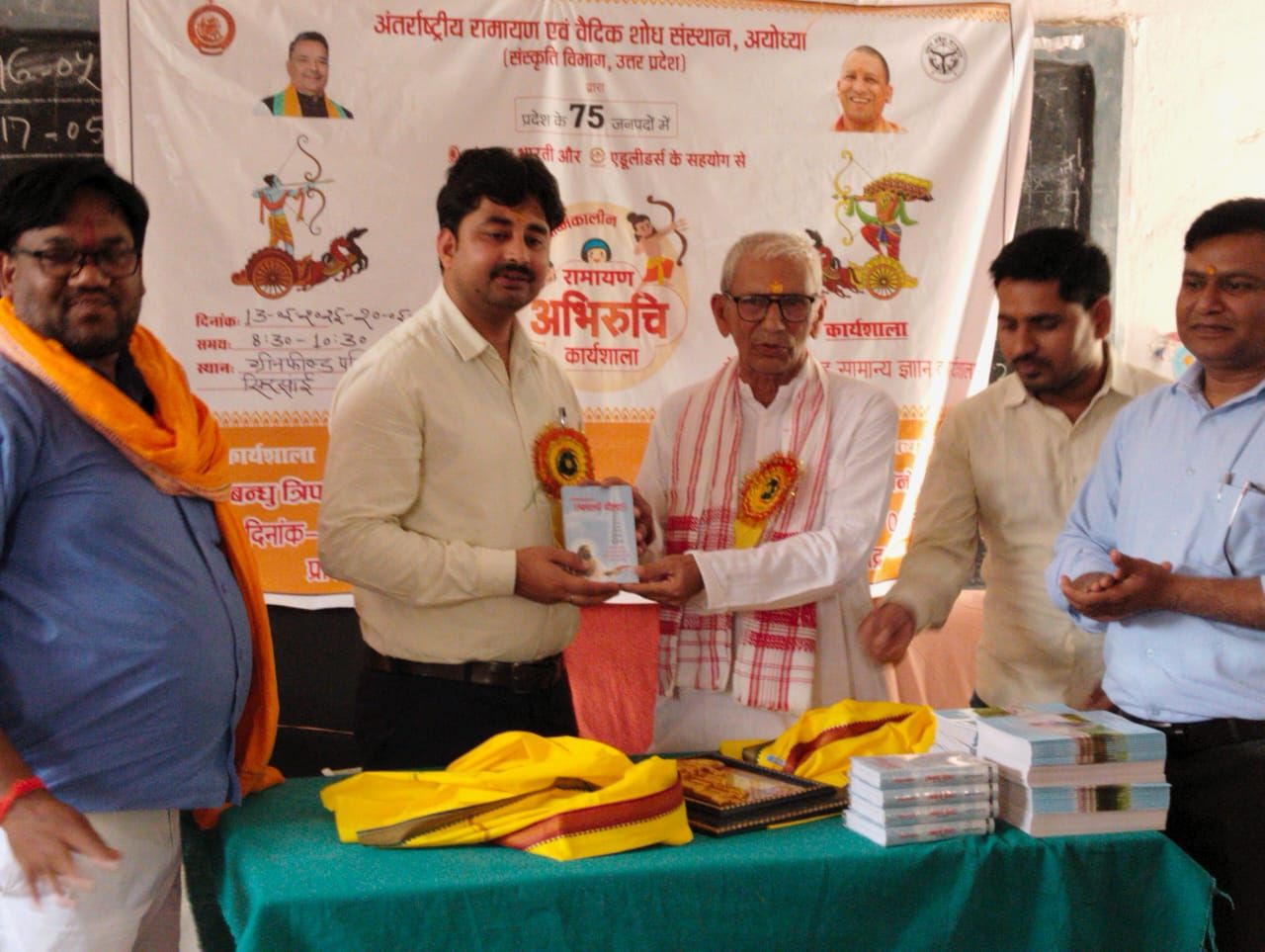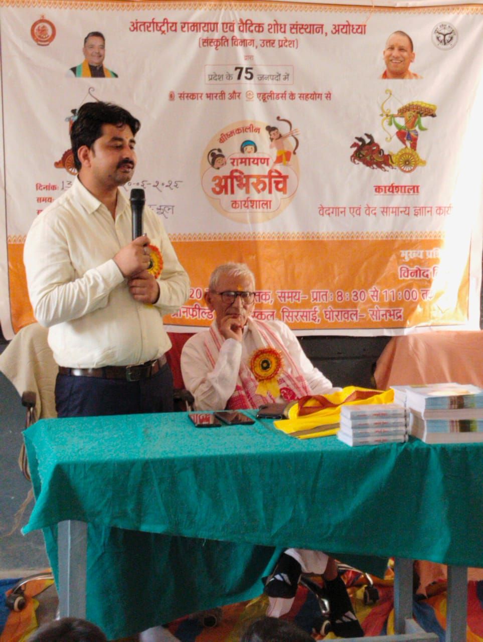 जिला बेसिक शिक्षा अधिकारी ने अपने उद्बोधन में कहा कि इस तरह की कार्यशाला से राष्ट्र निर्माण होता है।प्रत्येक स्कूल में इस तरह के आयोजन होने चाहिए।बच्चों सें संवाद करते हुए उन्होंने कहा कि आप भाग्यशाली हैं जो इस प्रकार की शिक्षा इस कार्यशाला से पा रहे हैं,क्योंकि इस तरह की शिक्षा जो हमें नैतिक बल प्रदान करती है।वेद का ज्ञान ऐसा है कि राष्ट्र के निर्माण में सहायक है।विशिष्ट अतिथि लालजी तिवारी ने अपने उद्बोधन में छात्रों से कहा कि सभी छात्र इन विद्याओं के निहितार्थ को जीवन में उतारें।छात्रों ने द्वय अतिथियों के सामने अब तक सीखे गये वेदमन्त्रों को संगीत की धुनों पर गाकर और समान्य वेद की जानकारी की प्रस्तुति देकर सबका मन मोह लिया।बताते चलें कि संस्कृति विभाग उत्तर प्रदेश के तत्वावधान में अन्तर्राष्ट्रीय रामायण एवं वैदिक शोध संस्थान अयोध्या के निर्देशन में संस्कार भारती व एडूलीडर्स के सहयोग से रामायण अभिरूचि कार्यशाला के अन्तर्गत वेदगायन व सामान्य वेदज्ञान कार्यशाला चल रही है।कार्यशाला में कुल एक सौ ईक्कीस बच्चे प्रतिभाग कर रहे हैं।कार्यशाला के मुख्य प्रशिक्षक विनोद तिवारी सहायक प्रशिक्षक अशोक चौबे व आनंद पाण्डेय रहे।इस अवसर पर जय सिंह,शिवशंकर,संतोष तिवारी व अन्यलोग उपस्थित रहे।कार्यक्रम कका नेतृत्व व आभार प्रदर्शन ग्रीन फील्ड पब्लिक स्कूल के प्रधानाचार्य अनुराग पाण्डेय ने किया।