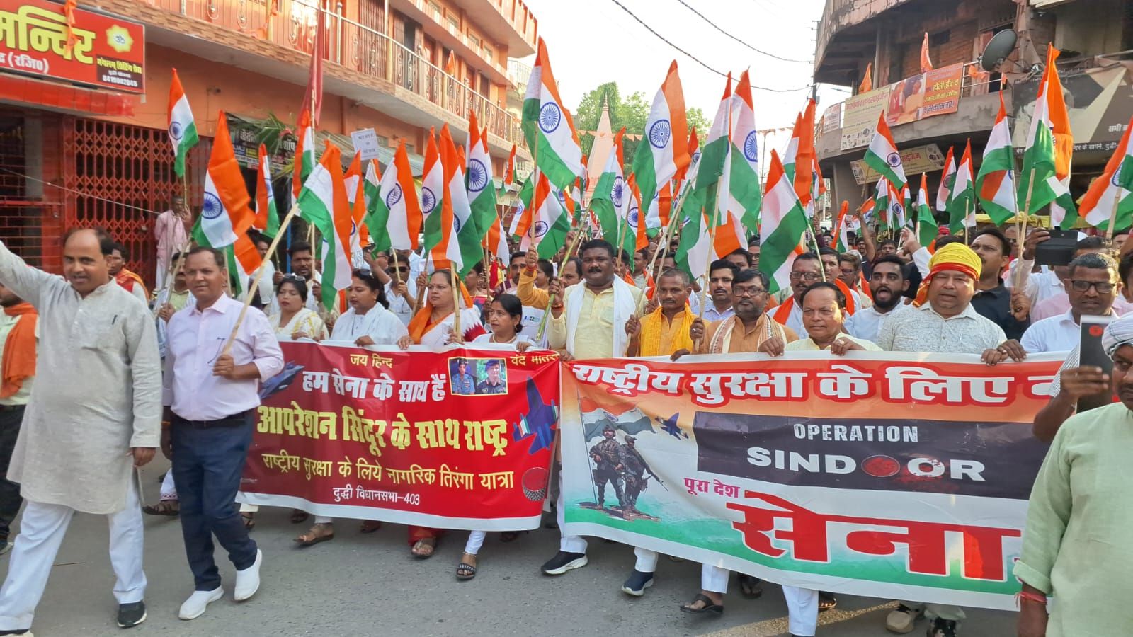 दुद्धी/सोनभद्र (मदन मोहन तिवारी) दुद्धी नगर में भाजपा कार्यकर्ताओं ने मंगलवार को भव्य तिरंगा शोभायात्रा निकाली। ऑपरेशन सिंदूर द्वारा भारतीय सेना के शौर्य में भाजपा कार्यकर्ताओं के साथ साथ विभिन्न सामाजिक, धार्मिक संगठनों के लोग एवं प्रबुद्धजनों ने भारत माता की जय जैसे गगनभेदी नारे व डीजे पर बजते देशभक्ति की धुन पर हाथों में तिरंगा लिए पूरे नगर का भ्रमण किया। भाजपा नेता श्रवण सिंह गोंड़ के नेतृत्व में निकली यात्रा में शामिल मुख्य अतिथि नंदलाल गुप्ता ने कहा कि हमारे भारतीय सेना के जवानों ने पाकिस्तान के भीतर घुस कर ऑपरेशन सिंदूर के तहत आतंकी संगठनों को बर्बाद कर दिया। सेना के शौर्य के सम्मान करने के लिए यह तिरंगा यात्रा निकाली गई है। हर भारतीय को ऑपरेशन सिंदूर की सफलता पर गर्व है। इस तिरंगा शोभायात्रा में नगर चेयरमैन कमलेश मोहन, कार्यक्रम के संयोजक मोहन गुप्ता, सहसंयोजक विनोद जायसवाल, मंडल अध्यक्ष दीपक शाह, सुरेन्द्र अग्रहरि, डॉ मिथिलेश, डॉ के के चौरसिया, बालकृष्ण जायसवाल, देवेंद्र गुप्ता, लालकेश कुशवाहा, मोहर लाल खरवार, वीरेंद्र चौधरी, रामनारायण शर्मा, राखी जायसवाल, कुसुम गुप्ता, संध्या देवी, मनोज सिंह बब्लू, प्रेमनारायण सिंह मोनू, नीरेंद्र, अमन जायसवाल समेत सैकड़ों छात्र-छात्राएं एवं प्रबुद्धजन मौजूद रहे।