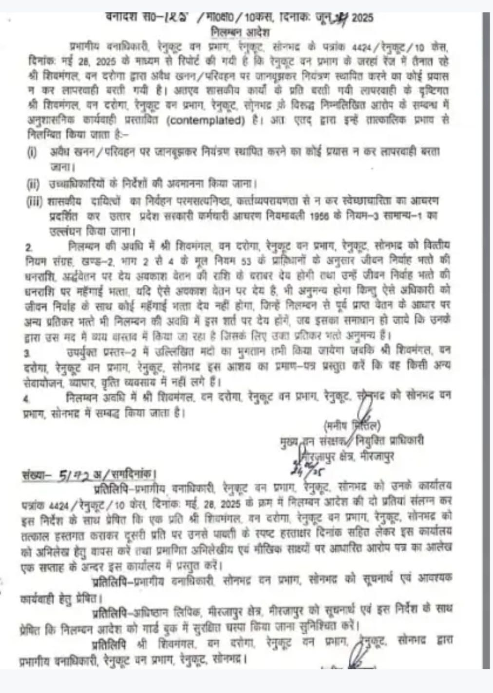पत्र का संज्ञान लेकर मनीष मित्तल, मुख्य वन संरक्षक, मिर्जापुर 24 जून शाम को वन दरोगा को निलंबित का आदेश डी एफ ओ सहित अन्य अधिकारी , वन दरोगा को प्रेषित किया गया। जिससे पूरे वन जरहा रेंज में हड़कंप मच गया।