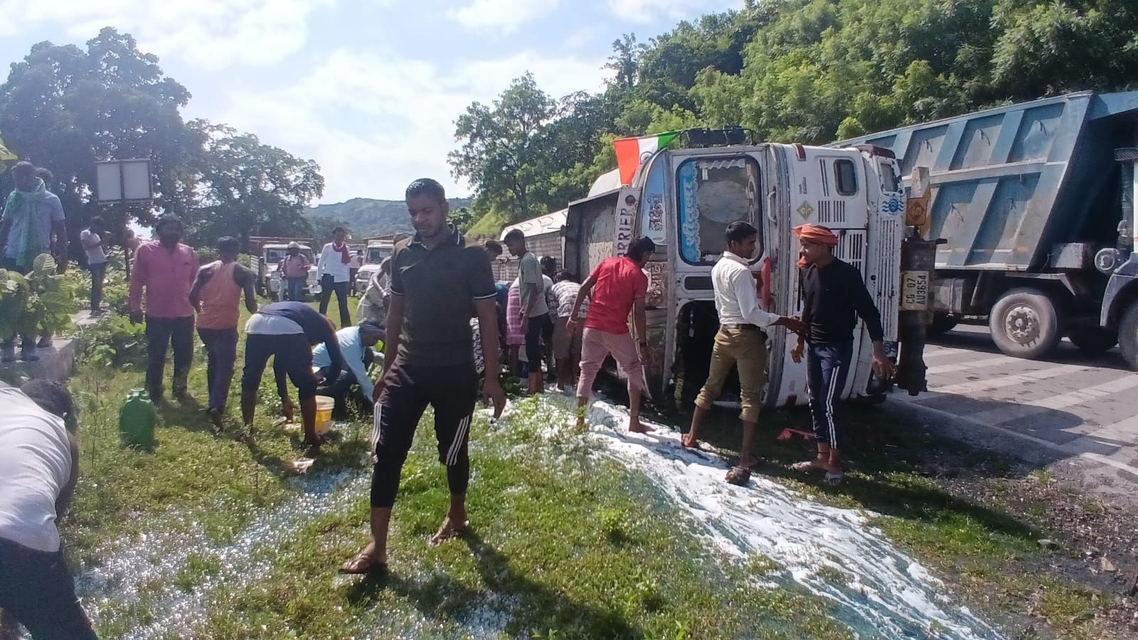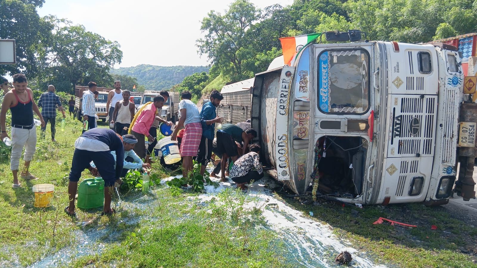 मारकुंडी घाटी मे डीजल लदा टैकर पलटा, बह रहे डीजल को भरने के लिए मचा अफरातफरी खलासी जख्मी