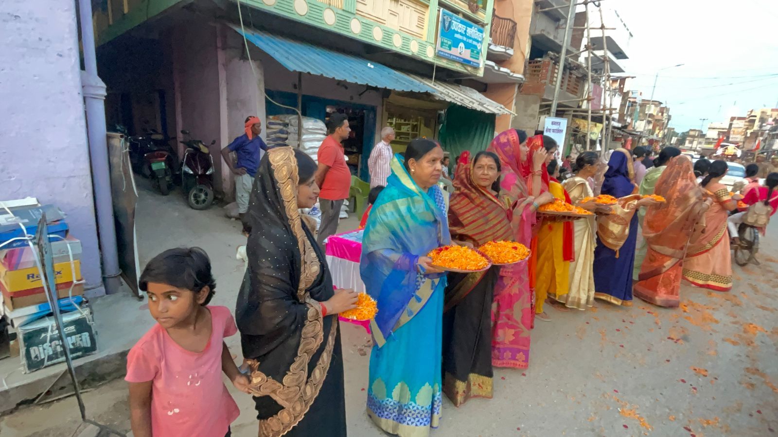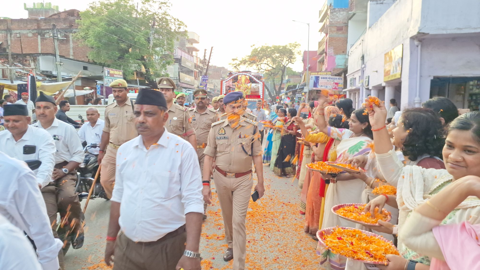 नगर की युवतियां व महिलाओं ने जगह जगह पर पुष्पवर्षा कर स्वयं सेवकों के अभिनंदन किया।