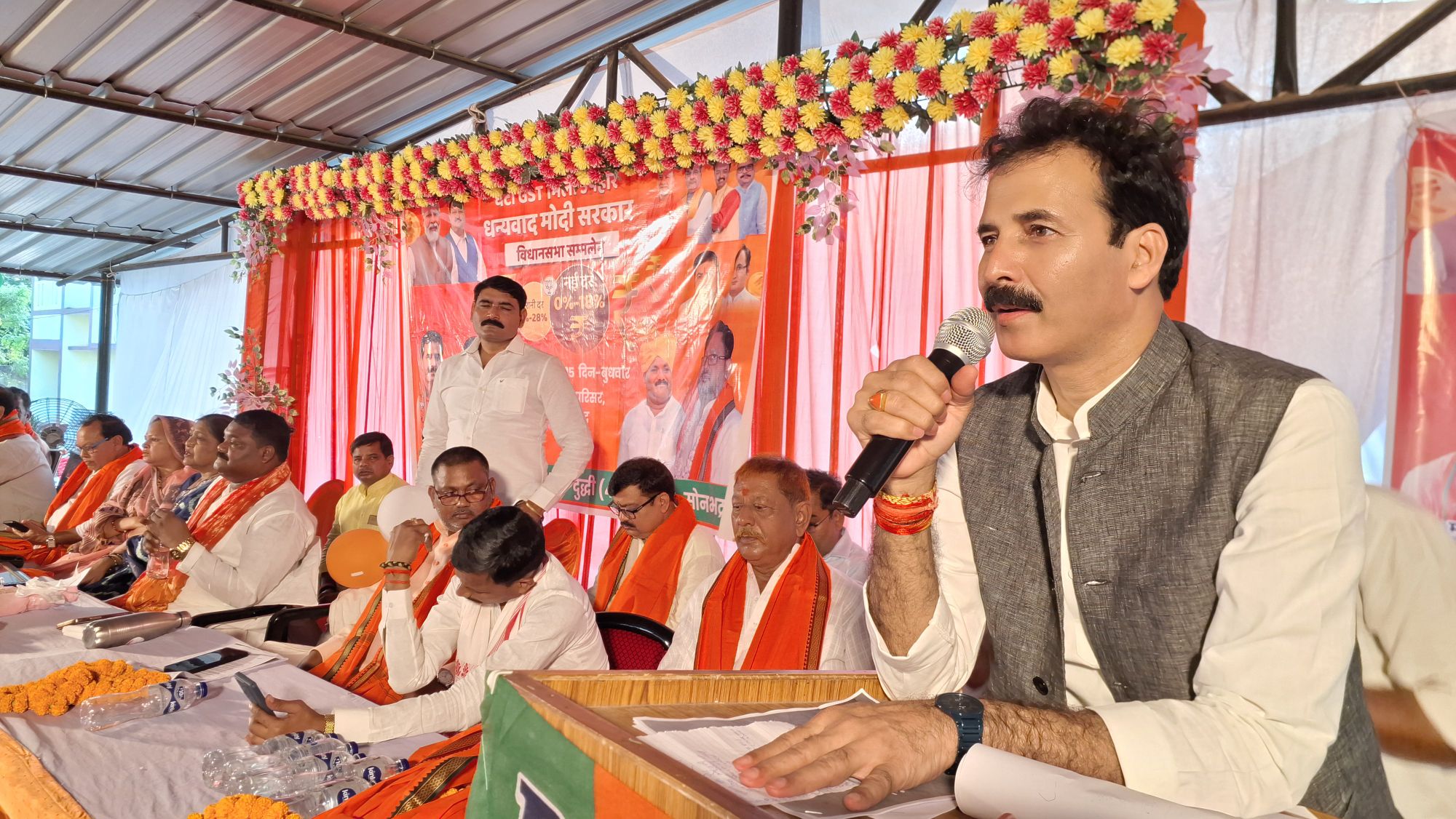 दुद्धी। बुधवार को ब्लॉक परिसर में शिक्षक, स्नातक व घटी जीएसटी पर विधानसभा सम्मेलन का आयोजन किया गया। जिसके मुख्य अतिथि एमएलसी श्यामनारायण सिंह उर्फ विनीत सिंह जिलाध्यक्ष नंदलाल गुप्ता ने श्यामा प्रसाद मुखर्जी दीनदयाल उपाध्याय के चित्र पर माल्यार्पण कर शुभारंभ किया। विधानसभा सम्मलेन को सम्बोधित करते हुए श्यामनारायण सिंह उर्फ विनीत सिंह ने कहा कि स्वदेशी अपनाए जिससे देश की आर्थिक स्थिति में सुधार होगी। केंद्र व राज्य सरकार द्वारा शिक्षा, स्वास्थ, रोजगार सहित तमाम योजनाओं को गरीबों तक पहुँचाने का काम कर रही है। सरकार निचले तपके के लोगों को लाभ देने का काम कर रहे हैं।