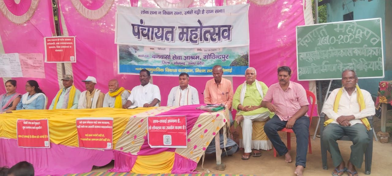 स्थानीय ब्लॉक के ग्राम पंचायत डुमरहर के बिछियारी स्थित बनवासी सेवा आश्रम के ग्राम निर्माण केंद्र परिसर में गुरुवार को पंचायत महोत्सव और क्षेत्रीय ग्राम स्वराज्य सम्मेलन का आयोजन क्षेत्रीय अध्यक्ष राम सुंदर के अध्यक्षता में किया गया जिसमे 28 ग्राम स्वराज्य सभा के अध्यक्ष,मंत्री और ग्रामीण अगुआ के साथ शिक्षक,शिक्षा मित्र,आंगनवाड़ी, रोजगार सेवक,प्रधान, शामिल रहें। कार्यक्रम में पंचायत को सशक्त बनाने ,पर्यावरण सरंक्षण, मशरूम उत्पादन से स्वावलंबन, शिक्षा, स्वास्थ्य को लेकर चर्चा की गई। छात्रों ने शिक्षा के गिरते स्तर, शराब के कारण घर और स्वास्थ्य की बर्बादी,आर्थिक गिरावट को लेकर नाटक प्रस्तुत किया।वही आदिवासी संस्कृति को बढ़ावा देने के लिए कर्मा की प्रस्तुति की गई। केवल दुबे और जगत भाई ने सिंगरौली परिक्षेत्र में औद्योगिक विकास से उपजी समस्या को लेकर विस्तार से जानकारी देते हुए चेतावनी दी कि लाख की तरह मनुष्य भी बांझपन का शिकार हो जायेगा।कहा कि क्षेत्र का कैरिंग कैपेसिटी का आकलन होना चाहिए। इश्वी पांडेय ने आश्रम की गतिविधियों की चर्चा की।साथ ही पलायन रोकने के लिए गांव में रोजगार सृजन की वकालत की। लड़कियां सिलाई से रोजगार सृजन कर सकती है। वनाधिकार के राज्य कमेटी के सदस्य, देवनारायण खरवार ने पंचायत को मजबूत बनाने,वनाधिकार ,की चर्चा की और कहा कि वनाधिकार को लेकर रुकी फाइलों का निस्तारण जल्द होना चाहिए।कार्यक्रम को प्रदीप पाण्डेय,दिल बरन, राम कुमार ,सोमारु राम, बाबूलाल,संगीता, आदि ने संबोधित किया। पंचायत में सक्रिय भूमिका के लिए रेखा देवी, सहित 8 स्वयं सेवकों को सम्मानित किया गया। संचालन शेर सिंह ने किया