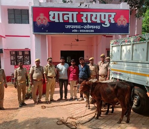 वैनी/सोनभद्र (राजन गुप्ता) बोलेरो पिकअप सहित तीन गौ तस्कर को रायपुर पुलिस ने गिरफ्तार। पुलिस अधीक्षक अभिषेक वर्मा के निर्देशन मे क्षेत्राधिकारी सदर के पर्यवेक्षण में थाना रायपुर पुलिस को बड़ी सफलता प्राप्त हुई है। रायपुर पुलिस द्वारा दीपा पहाड़ी गांव दरमा के रास्ते अधौरा (बिहार) की ओर जा रही एक बोलेरो पिकअप वाहन संख्या UP 64 AT 6082 को चेकिंग के दौरान पकड़ा गया। वाहन में गोवंश को वध हेतु अवैध रूप से बिहार ले जाया जा रहा था। पुलिस टीम द्वारा तत्परता से कार्यवाही करते हुए 3 आरोपी को मौके से गिरफ्तार किया गया तथा उनके कब्जे से 06 राशि गोवंश (बछड़े) बरामद किए गए।
