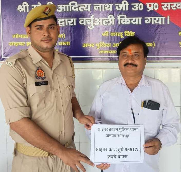 पुलिस अधीक्षक अभिषेक वर्मा द्वारा साइबर अपराधियों के विरूद्ध चलाये जा रहे विशेष अभियान के तहत ओबरा क्षेत्राधिकारी हर्ष पांडेय के दिशा निर्देशन में एवं थाना प्रभारी साइबर क्राइम पुलिस के नेतृत्व मे थाना साइबर टीम के द्वारा आवेदक रवि चौरसिया पुत्र शंकर प्रसाद चौरसिया निवासी दर्जी रोड मेन मार्केट रेणुकूट के साथ किसी अज्ञात व्यक्ति द्वारा फ्रांड कर के धनराशि को ट्रांसफर करा लिया गया था। जिसके क्रम मे त्वरित कारवाई करते हुये बैंक से पत्राचार करके फ्राड हुई धनराशि को होल्ड कराया गया एवं माननीय न्यायालय से धनराशि वापसी का आदेश प्राप्त कर सम्बन्धित बैंक से पत्राचार के क्रम में फ्राड हुई धनराशि में से 96517 को आवेदक के मूल खाते में सफलतापुर्वक वापस कराया गया। जिस पर आवेदक द्वारा पुलिस अधीक्षक, क्षेत्राधिकारी ओबरा के साथ साथ साइबर क्राइम पुलिस थाना के अधिकारी की भूरी भूरी प्रशंसा किया गया है।