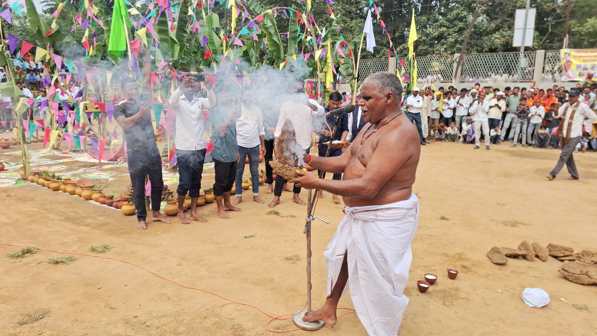 दुद्धी। वृहस्पतिवार को यादव महासभा के तत्वावधान में उत्तर प्रदेश के सोनभद्र जिले के दुद्धी में 15वां गोवर्धन पूजा का आयोजन किया गया। गाजीपुर के बाबा सुरेंद्र पंथी ने देखते ही देखते सूखे उपले में मंत्र शक्ति से अग्नि प्रज्वलित कर सबको आश्चर्यचकित कर दिया। इसके बाद उसी अग्नि में दूध गर्म किया गया तथा खीर पकाई गई। बाबा ने आग पर खौलते गर्म दूध से स्नान कर भविष्य के बारे में बताया कि आने वाले समय किसानों के लिए अनुकूल है। बारिश की भी अच्छी सम्भावना है। इस महीने में ठंड बारिश के साथ हवा होगी। पुश के महीने में ठंड, बादल ज साथ बारिश रहेगी। किसानों को 14 आना मतलब चैती की खेती अच्छी होगी।