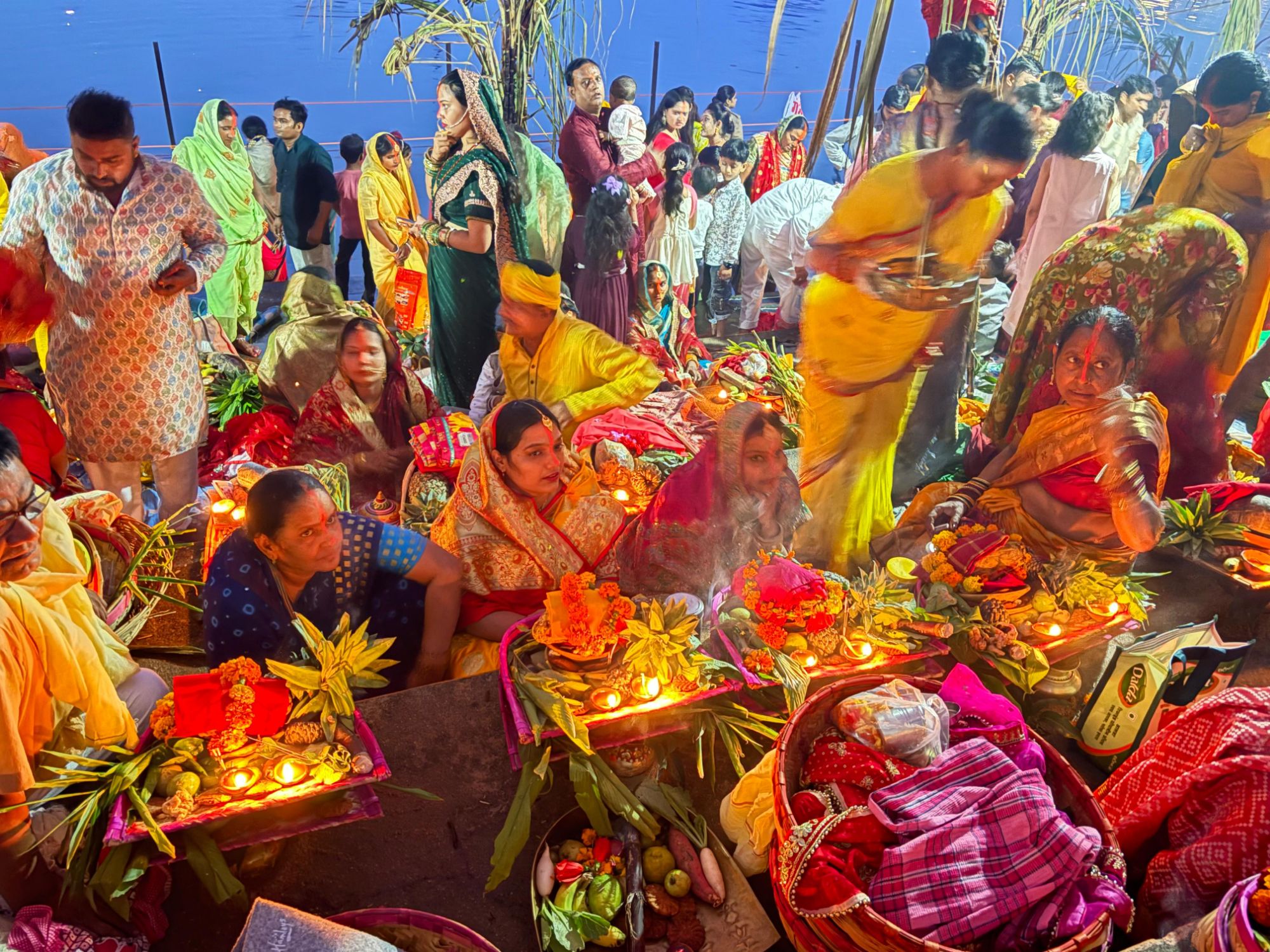 श्रद्धालुजन घाटों पर बेदी बनाकर,स्थान ग्रहण करने के बाद व्रती महिलाओं-पुरुषों ने भगवान भाष्कर के अस्त होने के कुछ समय पूर्व से ही तालाब में स्नान ध्यान कर, आराध्य देव की उपासना में जुट गयीं और अर्घ्य देकर उन्हें नमन किया। इस के बाद मंदिरों में भी घंटे-घड़ियालों की गूंज के बीच दर्शन पूजन का क्रम जारी रहा। घाट पर माँ गंगा आरती एवं देवी जागरण आकर्षण के केन्द्र रहे।