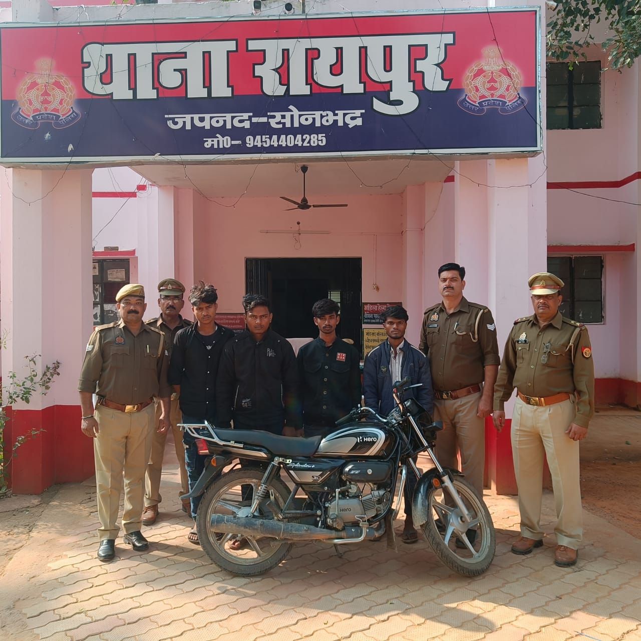 वैनी/सोनभद्र (राजन गुप्ता) रायपुर पुलिस ने चोरी की बाइक के साथ 4 आरोपी को किया गिरफ्तार। पुलिस अधीक्षक अभिषेक वर्मा के निर्देशन मे क्षेत्राधिकारी सदरराज सोनकर के पर्यवेक्षण में जनपद सोनभद्र में चोरी पर प्रभावी रोकथाम लगाने तथा चोरी की घटनाओं के शीघ्र अनावरण व उसमें संलिप्त अपराधियों की गिरफ्तारी हेतु चलाये जा रहे अभियान के क्रम में थाना रायपुर पुलिस द्वारा चोरी की बाइक बरामद करने एवं संलिप्त चार अभियुक्तगण की गिरफ्तारी में महत्वपूर्ण सफलता प्राप्त हुई है। रायपुर पुलिस कजियारी मोड़ पर संदिग्ध व्यक्ति एवं वाहनों की चेकिंग कर रही इसी दौरान चोरी की एक हीरो स्प्लेंडर मोटरसाइकिल के साथ चार अभियुक्तों को गिरफ्तार किया गया। उक्त बाइक के संबंध में थाना रायपुर पर मुकदमा अपराध संख्या 151/25 धारा 303(2) बीएनएस पंजीकृत है।
