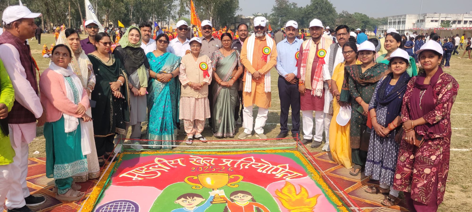 कार्यक्रम का आरम्भ माता माँ सरस्वती के प्रतिमा पर दीप प्रज्वलित कर पुष्प अर्पित किया गया। तत्पश्चात झंडारोहण किया गया। अतिथियों द्वारा मार्च पास्ट की सलामी ली गई। मंडल के बच्चे व शिक्षक एक साथ वन्दे मातरम् के 150 वर्ष पूर्ण होने पर क्रीड़ा प्रांगण में लगभग 1000 की संख्या में उपस्थित अतिथियों, शिक्षकों व बच्चों द्वारा वंदे मातरम् गीत का सामूहिक गान किया गया। मशाल धावक मशाल लेकर पूरे क्रीड़ा क्षेत्र कि परिक्रमा किया। जिला बेसिक शिक्षा