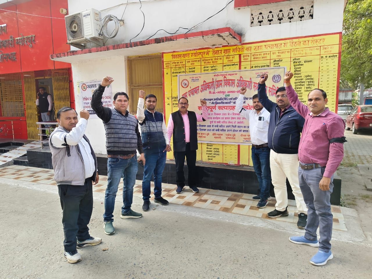 म्योरपुर। स्थानीय विकास खंड मुख्यालय पर ग्राम पंचायत अधिकारी और ग्राम विकास अधिकारी समन्वय समिति के लोगों ने ऑनलाइन उपस्थिति और गैर विभाग के कार्यों के विरोध में बृहस्पतिवार को प्रदर्शन किया। प्रदेश भर में चल रहे शांतिपूर्ण सत्याग्रह और आंदोलन को लेकर काली पट्टी बांधकर कर्मियों ने कार्यों को किया। इसके बाद उन्होंने ब्लॉक मुख्यालय पर सभा भी किया। इस दौरान उन्होंने कहा कि सभी लोग पांच दिसंबर को ज्ञापन सौंपने के बाद सरकारी ग्रुपों से लेफ्ट हो जाएंगे। इसके बाद 10 दिसंबर को सभी सचिव अपने वाहनों का उपयोग बंद कर देंगे। इसके अलावा 15 दिसंबर को सभी सचिव भुगतान के लिए लगाए जाने वाले डोंगल को भी जमा कर देंगे। उन्होंने कहा कि सरकार ऑनलाइन हाजिरी की व्यवस्था को वापस नहीं लेती है तो आंदोलन बड़े पैमाने पर चलता रहेगा। कार्यक्रम के दौरान ग्राम विकास अधिकारी संगठन के जिलाध्यक्ष अरुण सिंह, अरुण उपाध्याय, रामवृक्ष विश्वकर्मा, रामबहादुर सिंह, रामदर्शन यादव, योगेंद्र सिंह, राघवेंद्र सिंह समेत तमाम सचिव मौजूद रहे।