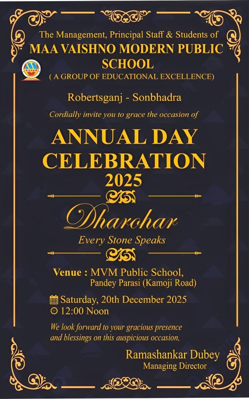 सोनभद्र (विकास द्विवेदी) माँ वैष्णों माडर्न पब्लिक स्कूल परासी पाण्डेय (कमोजी रोड) में 20 दिसंबर को वार्षिकोत्सव का आयोजन होगा। विद्यालय के एमडी आर एस दुबे ने बताया कि इस बार वार्षिकोत्सव का नाम धरोहर रखा गया है। धरोहर कार्यक्रम में मुख्य अतिथि उप्र राज्य सूचना आयुक्त पदुम नारायण द्विवेदी होगे। कार्यक्रम में स्कूल में पढ़ रहे छात्रों द्वारा एक से बढ़कर एक प्रस्तुति पेश करेंगे।
