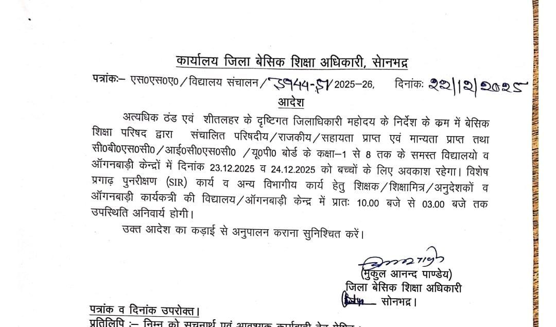 सोनभद्र (विकास द्विवेदी) सोनभद्र में अत्यधिक ठण्ड एवं शीतलहर के दृष्टिगत बेसिक शिक्षा परिषद के अन्तर्गत संचालित सरकारी एवं गैर सरकारी विद्यालय एवं यूपी बोर्ड /सीबीएसई बोर्ड/आईसीएसई बोर्ड के नर्सरी से कक्षा आठ तक के समस्त विद्यालय 23 व 24 दिसम्बर 2025 को शैक्षिक कार्य बन्द रहेगें। विद्यालयों में शिक्षक एवं शिक्षणेत्तर कर्मचारी पूर्व की भॉति विद्यालय में उपस्थित होकर यू-डायस, अपार आईडी, एसआईआर एवं अन्य विभागीय कार्य आदि सम्पन्न करेगें। यह जानकारी जिला बेसिक शिक्षा अधिकारी मुकुल आनंद पाण्डेय ने दी।