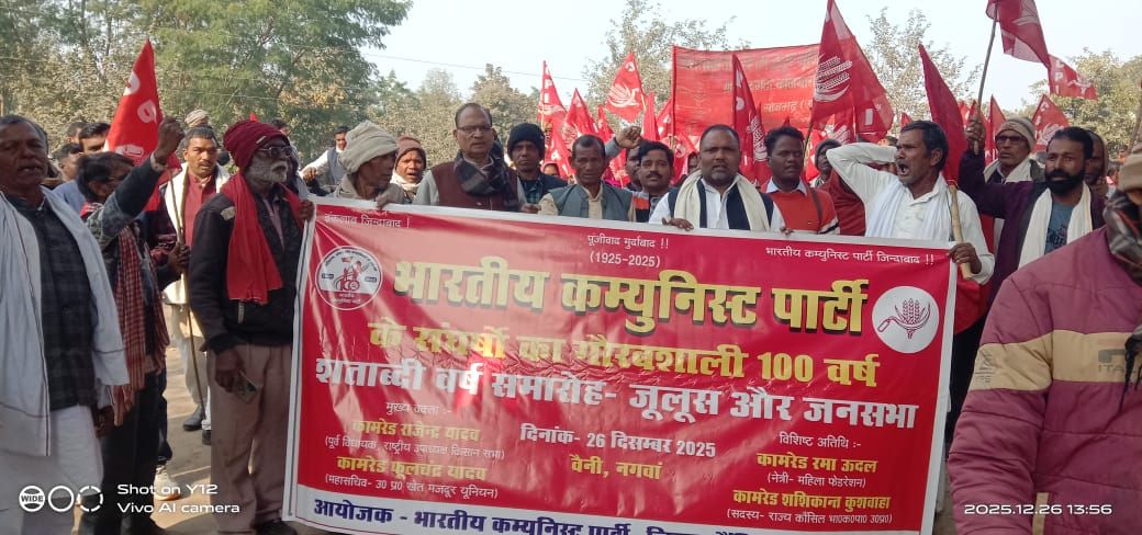 नगवां ब्लॉक के मुख्यालय पर शुक्रवार को भारतीय कम्युनिस्ट पार्टी (भाकपा) का 100वाँ स्थापना दिवस सोनभद्र जनपद के नगवां ब्लांक मुख्यालय पर जोरदार तरीके से धरना प्रदर्शन मनाया गया। इस अवसर पर वैनी दूबेपुर मोड़ से पार्टी कार्यकर्ताओं,आदिवासी, किसानों और मजदूरों ने सरकार विरोधी नारे लगाते हुए करीब 3 किलोमीटर लंबा जुलूस निकाला, जो नगवां विकासखंड कार्यालय परिसर के समक्ष पहुंचकर जनसभा में तब्दील हो गया।