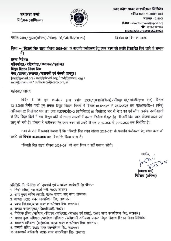 सरकार द्वारा उपभोक्ताओं के लिए चलाई जा रही बिजली बिल राहत योजना के प्रथम चरण के अंतिम दिन ही शेष बचे थे अब प्रथम चरण के लिए तीन दिन की अवधि बढ़ा दी गई है अब तीन जनवरी तक पंजीकरण ओ टी एस के माध्यम से क्षेत्र के समस्त उपभोक्ता अपना अपना पंजीकरण करवा सकते हैं इस बात की जानकारी बभनी उपकेंद्र के अवर अभियंता बभनी महेश कुमार ने दी है उन्होंने बभनी और म्योरपुर के समस्त कनेक्शन धारी उपभोक्ता से अपील किया है कि इस बढ़े हुए समय सीमा में अपना पंजीकरण करवा कर बिजली बिल में भारी छूट का लाभ उठा लें इस योजना में विद्युत बिल और विद्युत चोरी के समस्त प्रकरणों में राजस्व निर्धारण में छूट हेतु बिजली राहत योजना में अगले बढ़े हुए समय सीमा में पंजीकरण करवा कर लाभ प्राप्त कर ले।इस बढ़े हुए समय सीमा में प्रथम चरण के तहत सारी शर्ते और छूट पूर्व की भांति ही रहेंगी ।इस बढ़े हुए समय में अपने अपने बिजली बिल राहत योजना में जुड़कर अपनी बिजली बिल संबंधी समस्याओं के निदान के लिए ओ टी एस करवाकर अधिक से अधिक बिल माफी योजना का लाभ उठा लें इस बात की जानकारी अवर अभियंता बभनी महेश कुमार ने दी और क्षेत्र के समस्त कनेक्शन धारियों उपभोक्ताओं से अपील किया है कि समय सीमा के अंदर योजना का लाभ प्राप्त ले और अपनी अपनी बिजली संबंधी समस्याओं से निजाद पाने के लिए तत्काल समय सीमा के अंदर ओ टी एस के तहत पंजीकरण करवा ले ताकि समस्त उपभोक्ता को योजना का लाभ मिल सके । उन्होंने क्षेत्र के उपभोक्ताओं के लिए डोर टू डोर जाकर उनकी समस्या के समाधान के लिए अपील करते हुए निवेदन किया। साथ ही समस्त बिजली कर्मियों को भी निर्देश दिया है कि क्षेत्र के समस्त कनेक्शन धारियों उपभोक्ताओं से संपर्क कर उनका सहयोग करते हुए बिजली बिल राहत योजना में पंजीकरण करवाकर उनका सहयोग करें जिससे सरकार की मंशा पूरी हो सके ।