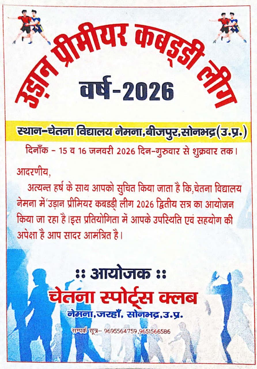 बीजपुर(रामजियावन गुप्ता)।जिले के खेल प्रेमियों के लिए एक अच्छी खबर है। बीजपुर क्षेत्र के नेमना स्थित चेतना विद्यालय के खेल मैदान पर ‘उड़ान प्रीमियर कबड्डी लीग के द्वितीय सत्र का भव्य आयोजन किया जा रहा है। दो दिवसीय इस खेल महाकुंभ की शुरुआत 15 जनवरी से होगी।