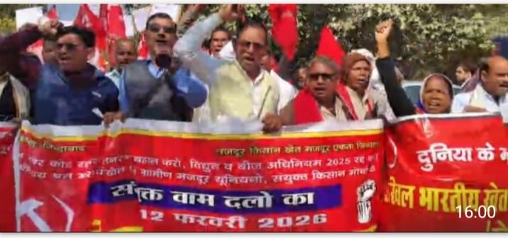 सोनभद्र (ओम प्रकाश गुप्ता) देश व्यापी हड़ताल को समर्थन देते हुए संयुक्त वाम दल के कार्यकर्ताओं ने सोनभद्र में जूलूस निकालकर कर कलेक्ट्रेट पर किया जोरदार धरना प्रदर्शन। जहां वक्ताओं ने कहा कि देश व राज्य में सत्तारूढ़ बीजेपी सरकार की श्रमिकों, किसानों, खेत मजदूरों , आदिवासियों , नौजवानों, महिलाओं , दस्तकारों, दुकानदारों, व्यापारियों, छोटे उद्योगों, छात्रों और स्कीम वर्करों एवं मध्यम वर्ग विरोधी नीतियों के विरुद्ध दस केंद्रीय श्रमिक संगठनों, संयुक्त किसान मोर्चा, संयुक्त खेत मजदूर यूनियन एवं संयुक्त वाम दलों द्वारा 12 फरवरी 2026 को राष्ट्र व्यापी आम हड़ताल के आवाहन पर जनपद सोनभद्र की जिला कमेटियां इस हड़ताल का पुरजोर तरीके से समर्थन करते हुए और केंद्र व राज्य सरकार की जनविरोधी नीतियों के खिलाफ आक्रोश व्यक्त करती है और आज हम