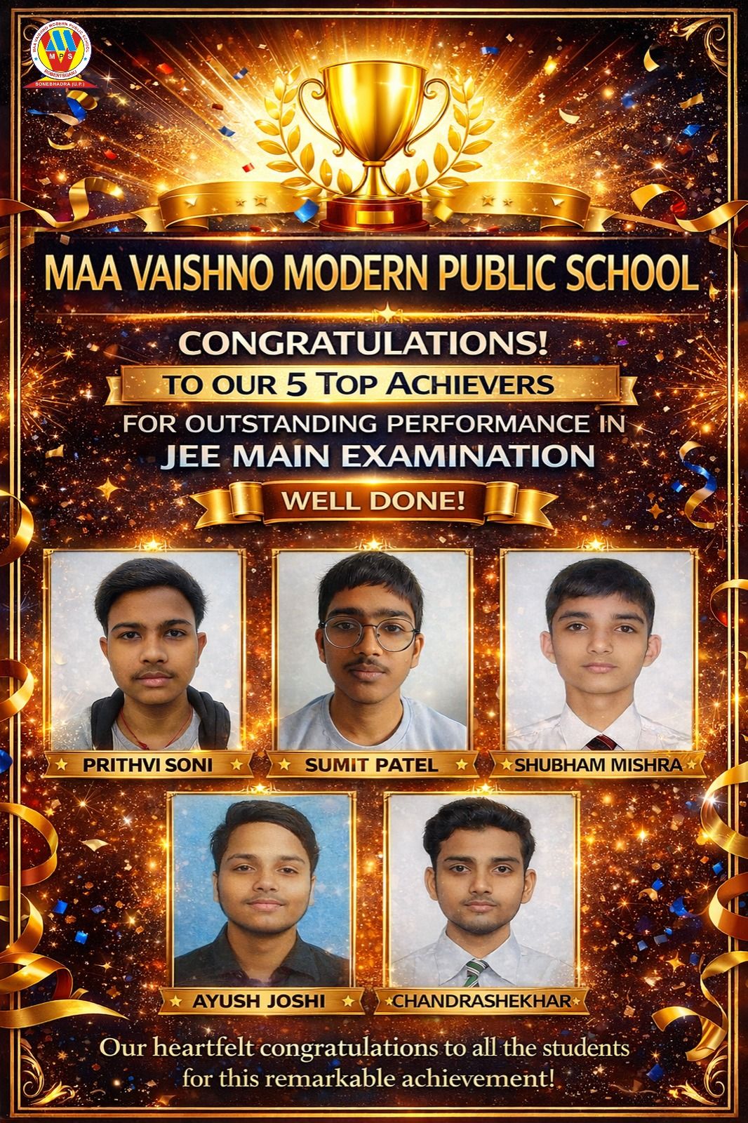 सोनभद्र (विकास द्विवेदी) माँ वैष्णो मॉडर्न पब्लिक स्कूल के लिए यह अत्यंत गर्व और हर्ष का विषय है कि विद्यालय के पाँच मेधावी विद्यार्थियों पृथ्वी सोनी, चंद्रशेखर, शुभम मिश्रा, सुमित पटेल एवं आयुष जोशी ने प्रतिष्ठित JEE Main परीक्षा में उत्कृष्ट प्रदर्शन कर विद्यालय, अभिभावकों एवं जनपद का नाम गौरवान्वित किया है। यह सफलता विद्यार्थियों की निरंतर मेहनत, अनुशासन, सकारात्मक सोच और लक्ष्य के प्रति समर्पण का परिणाम है।