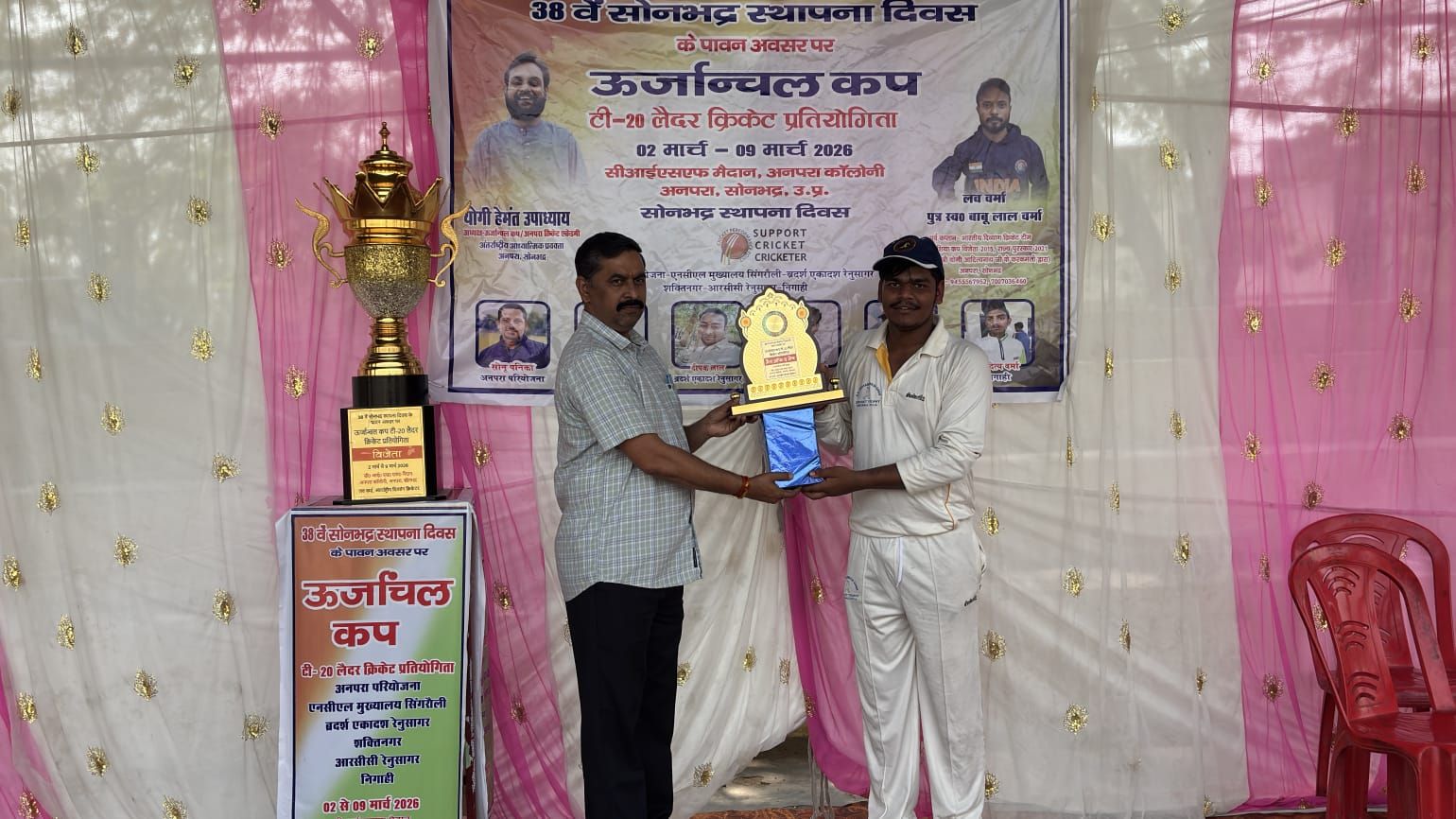 अनपरा/सोनभद्र 38 वें सोनभद्र स्थापना दिवस के अवसर पर ऊर्जाचल कप टी 20 लैदर क्रिकेट प्रतियोगिता के तीसरे दिन के पहले मैच में एनसीएल मुख्यालय सिंगरौली ने अनपरा परियोजना को 6 विकेट से हरा दिया। अनपरा ने पहले बल्लेबाजी करते हुए 20 ओवरों में 4 विकेट पर 185 रन बनाये जिसमें विश्वजीत सिंह ने शानदार शतक लगाते हुए 105 रन बनाये जवाब में सिंगरौली ने 19 ओवर में 3 विकेट खोकर 186 रन बना लिए जिसमें साहिल जायसवाल ने नाबाद 60 व राहुल ने नाबाद 60 रन बनाये। मैन आफ द मैच अधिवक्ता अरुण कुमार पांडेय द्वारा साहिल जायसवाल को दिया गया। दूसरे मैच में रोमांचक मुकाबले में निगाही ने आरसीसी रेनुसागर को 2 रनों से हराया जिसमें निगाही पहले बल्लेबाजी करते हुए 19.2 ओवरों में 109 रनों पर सिमट गई निगाही की तरफ से चंद्र प्रकाश ने 26 रन बनाए, आरसीसी रेनुसागर के तरफ से अनिल, जितेंद्र, सनी,आलोक ने 2-2 विकेट लिए जवाब में आरसीसी रेनुसागर 107 रनों पर सिमट गई जिसमें सतेंद्र, विजय ने 25-25 रन बनाए निगाही के तरफ से बी.किरण कुमार ने 5 विकेट, राकेश चंदेल ने अपने ओवर में अंतिम 3 विकेट लेकर टीम को विजयी कराया । बी.किरण कुमार को मैन आफ द मैच दिया गया । शनिवार को पहला मैच निगाही बनाम शक्तिनगर एवं दूसरा मैच एनसीएल मुख्यालय सिंगरौली बनाम ब्रदर्स एकादश रेनुसागर से खेला जाएगा ।