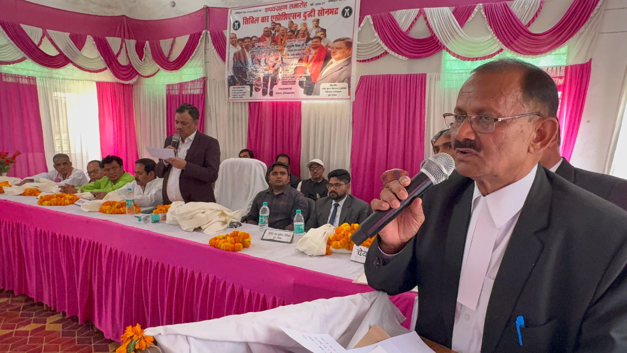 समारोह को सम्बोधित करते हुए मुख्य अतिथि विनोद पांडेय ने कहा कि अधिवक्ताओं का हित सर्वोपरि है। अधिवक्ताओं के हित मे अधिवक्ता प्रोटेक्शन एक्ट लागू कियर जाने की लड़ाई सरकार से लड़ी जा रही है। सरकार अधिवक्ताओं के साथ अन्याय कर रही है, जिसका विरोध बार काउंसिल अंतिम दम तक करेगा। उन्होंने नई कार्यकारिणी का आभार जताया।समारोह अध्यक्ष एमएलसी अशुतोष सिन्हा ने कहा कि मैं भी अधिवक्ता समाज से हूं, इसलिए अधिवक्ताओं की पीड़ा अच्छी तरह महसूस करता हूं। उन्होंने कहा कि सरकार में बार-बार अधिवक्ता प्रोटेक्शन एक्ट लागू करने के सवाल पर,सरकार ने समिति गठित कर दिया है। शीघ्र ही समिति से रिपोर्ट तैयार कराकर, उसे लागू कराने का प्रयास करूंगा। उन्होंने कचहरी परिसर में डॉ राजेन्द्र भवन के लिए दिए गए पांच लाख रुपये का उपयोग करने के उपरांत उसके साज सज्जा, फर्नीचर आदि के लिए पांच लाख अलग से देने का आश्वासन दिया। पूर्व विधायक हरिराम चेरो, एसडीएम निखिल यादव, चेयरमैन कमलेश मोहन, दुद्धी बार अध्यक्ष कुलभूषण पांडेय, नंदलाल,प्रभु सिंह,रामनिहोर यादव,जुबेर आलम,अवधनारायण यादव समेत अन्य अतिथियों ने नई कार्यकारिणी को बधाई दी और कहा कि संगठन के लिए यह गौरव का क्षण है। उन्होंने वादकारी हित में बार एवं बेंच को सामंजस्य स्थापित कर लोगों को न्याय दिलाने की अपील की। नवनिर्वाचित अध्यक्ष रामलोचन तिवारी ने सबका आभार जताया। इसके पूर्व मुख्य अतिथि समेत सभी अतिथियों का माल्यार्पण एवं अंगवस्त्रम से सम्मान किया गया।